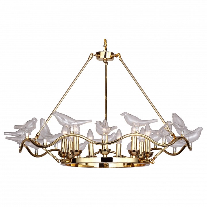 Подвесная люстра 1750-9P производства Favourite (Германия) из коллекции Pajaritos выполнена в стиле модерн. Арматура светильника выполнена из металла золотого цвета. Поверхность арматуры глянцевая. Плафон изготовлен из стекла Декоративные элементы выполнены из стекла.Осветительный прибор рассчитан на освещение пространства площадью 18 кв. м. Тип цоколя используемых ламп E14. Производитель рекомендует использовать лампы мощностью не более 40 Вт. Суммарная мощность светильника составляет 360 Вт. Лампочки в комплект не входят. Защита от попадания влаги и пыли внутрь изделия не предусмотрена. Рекомендуем к применению в гостиной, кабинете, спальне.