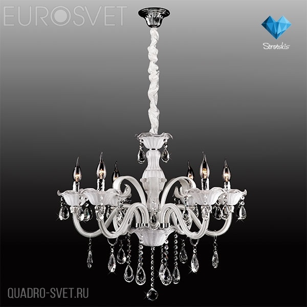 металла и стекла белого и хромового цветов. Поверхность арматуры глянцево-матовая. Плафон отсутствует. Декоративные элементы выполнены из хрусталя. Осветительный прибор рассчитан на освещение пространства площадью 29 кв. м. Тип цоколя используемых ламп E14. Производитель рекомендует использовать лампы мощностью не более 60 Вт. Суммарная мощность светильника составляет 360 Вт. Лампочки в комплект не входят. Защита от попадания влаги и пыли внутрь изделия не предусмотрена. Рекомендуем к применению в гостиной, кабинете, спальне.