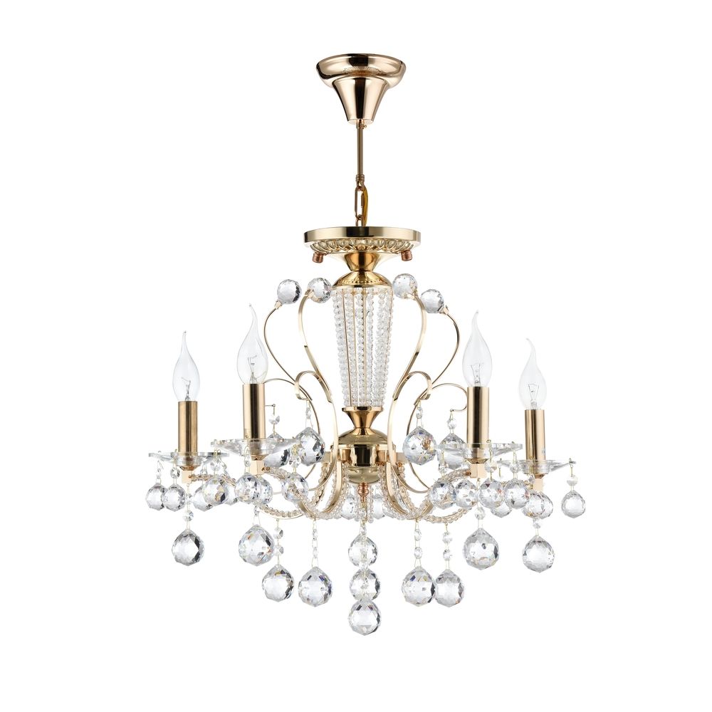 Хрустальная подвесная люстра FR1130-PL-05-G производства Freya (Германия) из коллекции Marlin выполнена в стиле классика. Арматура светильника выполнена из металла золотого цвета. Поверхность арматуры глянцевая. Плафон отсутствует. Декоративные элементы выполнены из хрусталя.Осветительный прибор рассчитан на освещение пространства площадью 10 кв. м. Тип цоколя используемых ламп E14. Производитель рекомендует использовать лампы мощностью не более 40 Вт. Суммарная мощность светильника составляет 200 Вт. Лампочки в комплект не входят. Защита от попадания влаги и пыли внутрь изделия не предусмотрена. Рекомендуем к применению в гостиной, кабинете, спальне.