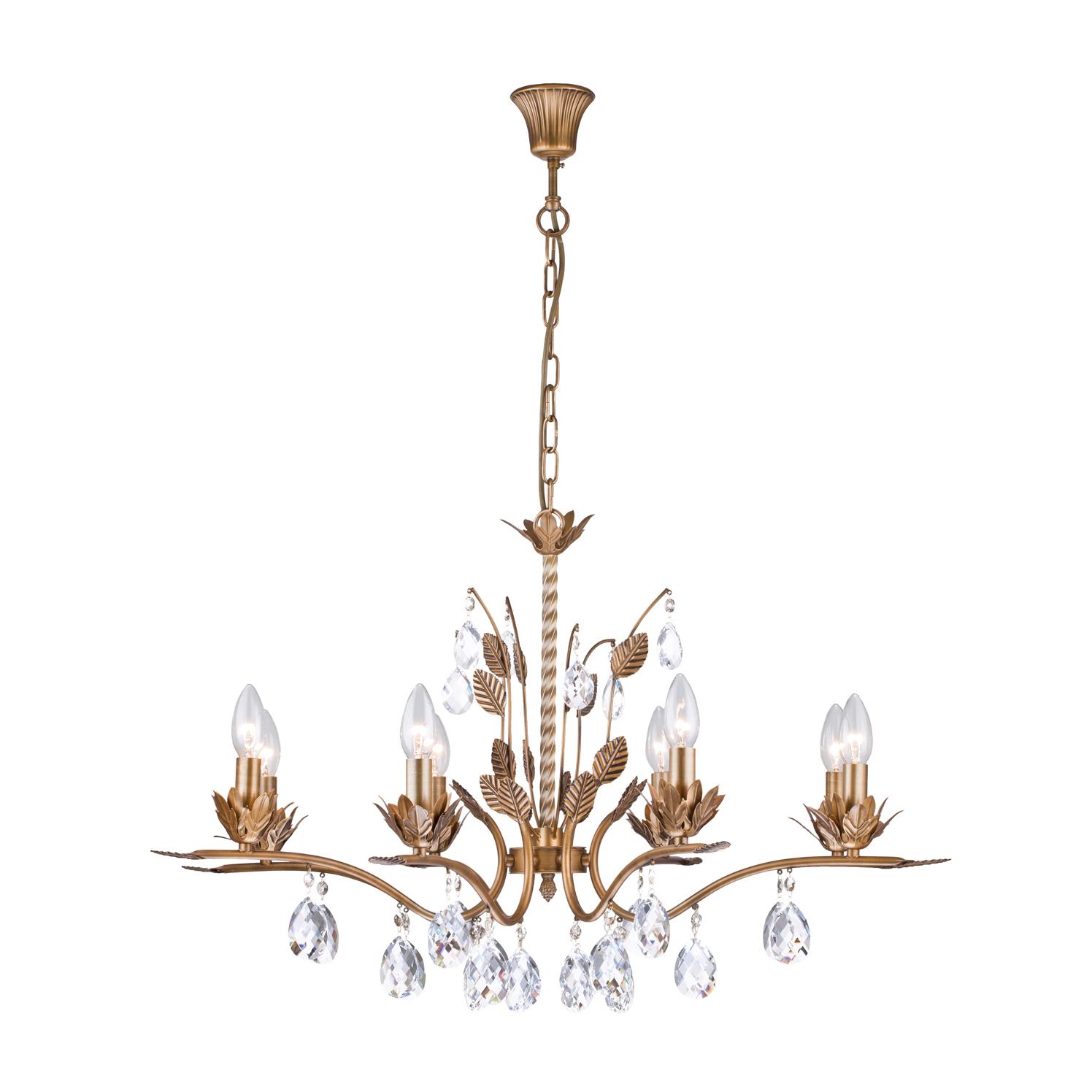 металла цвета античное золото. Поверхность арматуры глянцевая. Плафон отсутствует. Декоративные элементы выполнены из прозрачного хрусталя. Осветительный прибор рассчитан на освещение пространства площадью 16 кв. м. Тип цоколя используемых ламп E14. Производитель рекомендует использовать лампы мощностью не более 40 Вт. Суммарная мощность светильника составляет 320 Вт. Лампочки в комплект не входят. Защита от попадания влаги и пыли внутрь изделия не предусмотрена. Рекомендуем к применению в гостиной, кабинете, спальне.