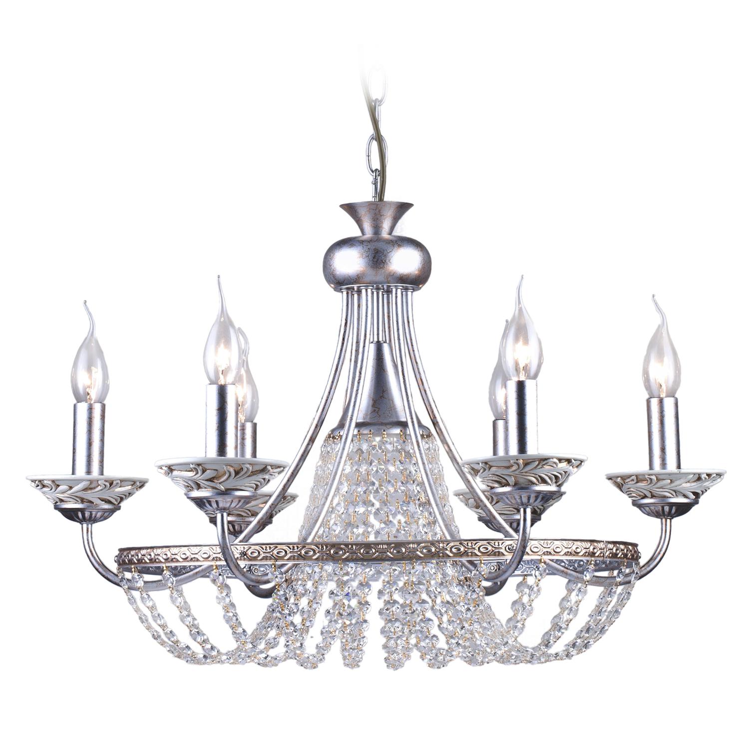 металла серебристого цвета. Поверхность арматуры матовая, рельефная. Плафон отсутствует. Декоративные элементы выполнены из прозрачного хрусталя. Осветительный прибор рассчитан на освещение пространства площадью 12 кв. м. Тип цоколя используемых ламп E14. Производитель рекомендует использовать лампы мощностью не более 40 Вт. Суммарная мощность светильника составляет 240 Вт. Лампочки в комплект не входят. Защита от попадания влаги и пыли внутрь изделия не предусмотрена. Рекомендуем к применению в гостиной, кабинете, спальне.