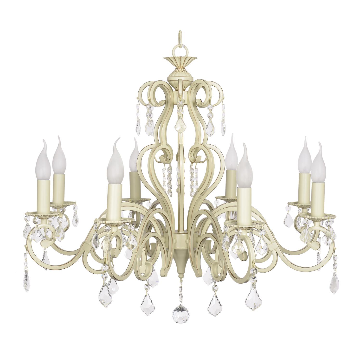 металла кремового цвета. Поверхность арматуры матовая. Плафон отсутствует. Декоративные элементы выполнены из прозрачного хрусталя. Осветительный прибор рассчитан на освещение пространства площадью 16 кв. м. Тип цоколя используемых ламп E14. Производитель рекомендует использовать лампы мощностью не более 40 Вт. Суммарная мощность светильника составляет 320 Вт. Лампочки в комплект не входят. Защита от попадания влаги и пыли внутрь изделия не предусмотрена. Рекомендуем к применению в гостиной, кабинете, спальне.
