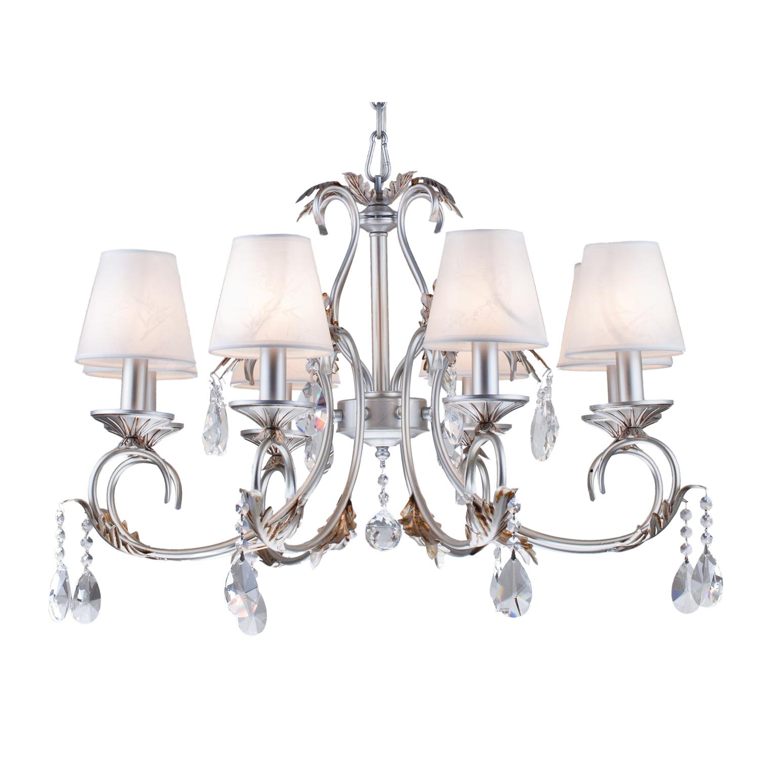 металла серебристого цвета. Поверхность арматуры глянцевая. Плафон изготовлен из текстиля белого цвета, имеет конусную форму и матовую поверхность. Направлен вверх и вниз. Декоративные элементы выполнены из прозрачного хрусталя. Осветительный прибор рассчитан на освещение пространства площадью 16 кв. м. Тип цоколя используемых ламп E14. Производитель рекомендует использовать лампы мощностью не более 40 Вт. Суммарная мощность светильника составляет 320 Вт. Лампочки в комплект не входят. Защита от попадания влаги и пыли внутрь изделия не предусмотрена. Рекомендуем к применению в гостиной, кабинете, спальне.