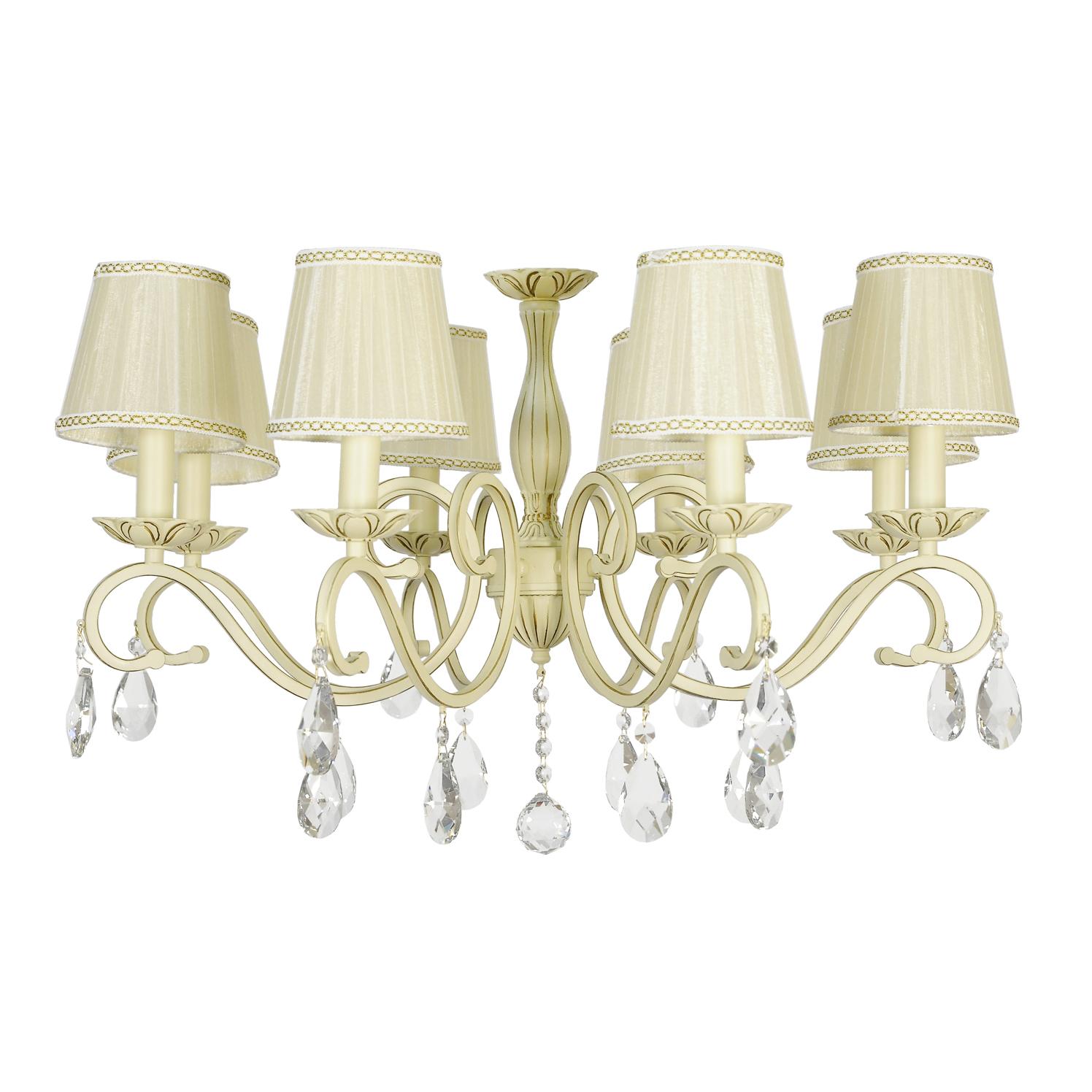 металла кремового цвета. Поверхность арматуры матовая. Плафон изготовлен из текстиля кремового цвета, имеет конусную форму и матовую поверхность. Направлен вверх и вниз. Декоративные элементы выполнены из прозрачного хрусталя. Осветительный прибор рассчитан на освещение пространства площадью 16 кв. м. Тип цоколя используемых ламп E14. Производитель рекомендует использовать лампы мощностью не более 40 Вт. Суммарная мощность светильника составляет 320 Вт. Лампочки в комплект не входят. Защита от попадания влаги и пыли внутрь изделия не предусмотрена. Рекомендуем к применению в гостиной, кабинете, спальне.