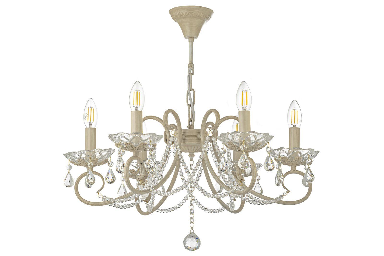 металла кремового и золотого цветов. Поверхность арматуры глянцевая. Плафон отсутствует. Декоративные элементы выполнены из прозрачного хрусталя. Осветительный прибор рассчитан на освещение пространства площадью 12 кв. м. Тип цоколя используемых ламп E14. Производитель рекомендует использовать лампы мощностью не более 40 Вт. Суммарная мощность светильника составляет 240 Вт. Лампочки в комплект не входят. Защита от попадания влаги и пыли внутрь изделия не предусмотрена. Рекомендуем к применению в гостиной, кабинете, спальне.