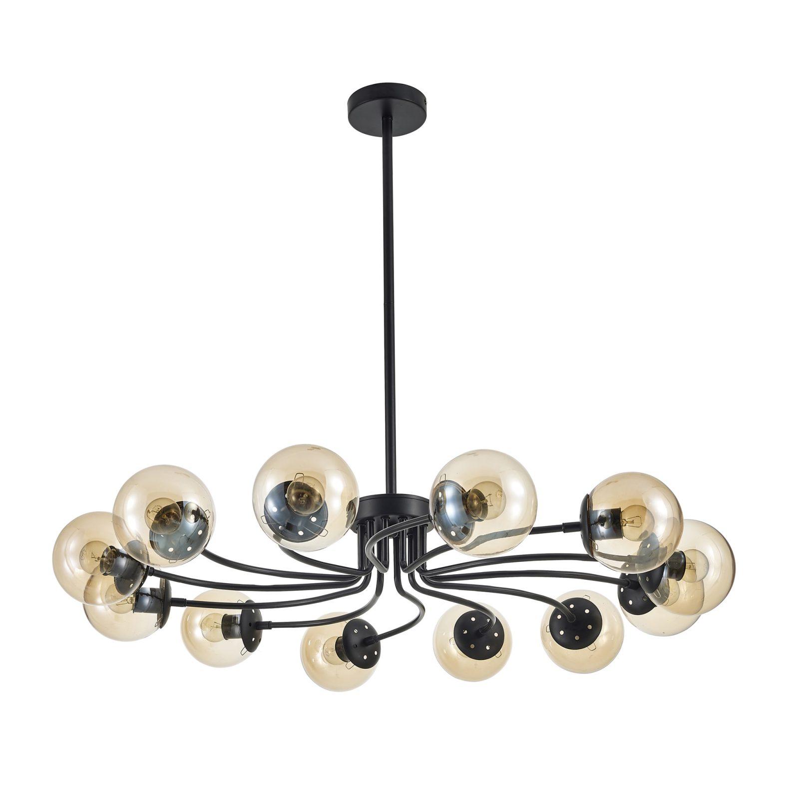 металла черного цвета. Поверхность арматуры матовая. Плафон изготовлен из стекла янтарного цвета, имеет конусную форму и матовую поверхность. Направлен вниз. Осветительный прибор рассчитан на освещение пространства площадью 36 кв. м. Тип цоколя используемых ламп E27. Производитель рекомендует использовать лампы мощностью не более 60 Вт. Суммарная мощность светильника составляет 720 Вт. Лампочки в комплект не входят. Защита от попадания влаги и пыли внутрь изделия не предусмотрена. Рекомендуем к применению в гостиной, кабинете, спальне.