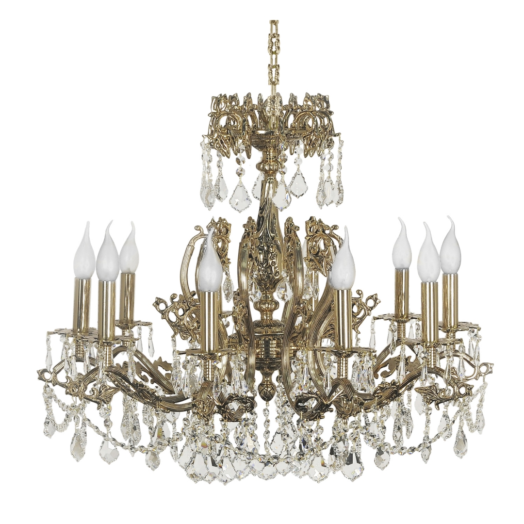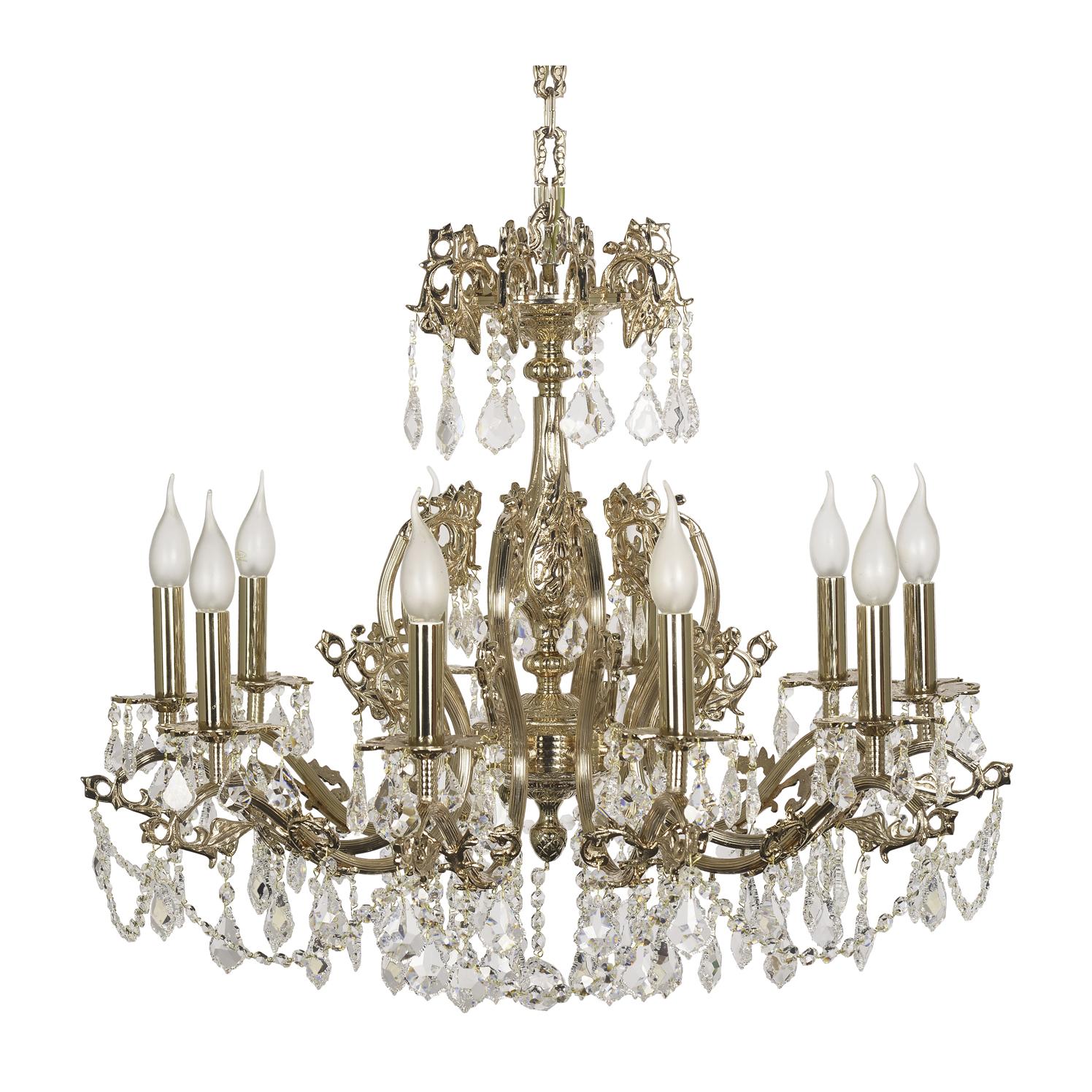 металла золотого цвета. Поверхность арматуры глянцевая. Плафон отсутствует. Декоративные элементы выполнены из прозрачного хрусталя. Осветительный прибор рассчитан на освещение пространства площадью 20 кв. м. Тип цоколя используемых ламп E14. Производитель рекомендует использовать лампы мощностью не более 40 Вт. Суммарная мощность светильника составляет 400 Вт. Лампочки в комплект не входят. Защита от попадания влаги и пыли внутрь изделия не предусмотрена. Рекомендуем к применению в гостиной, кабинете, спальне.