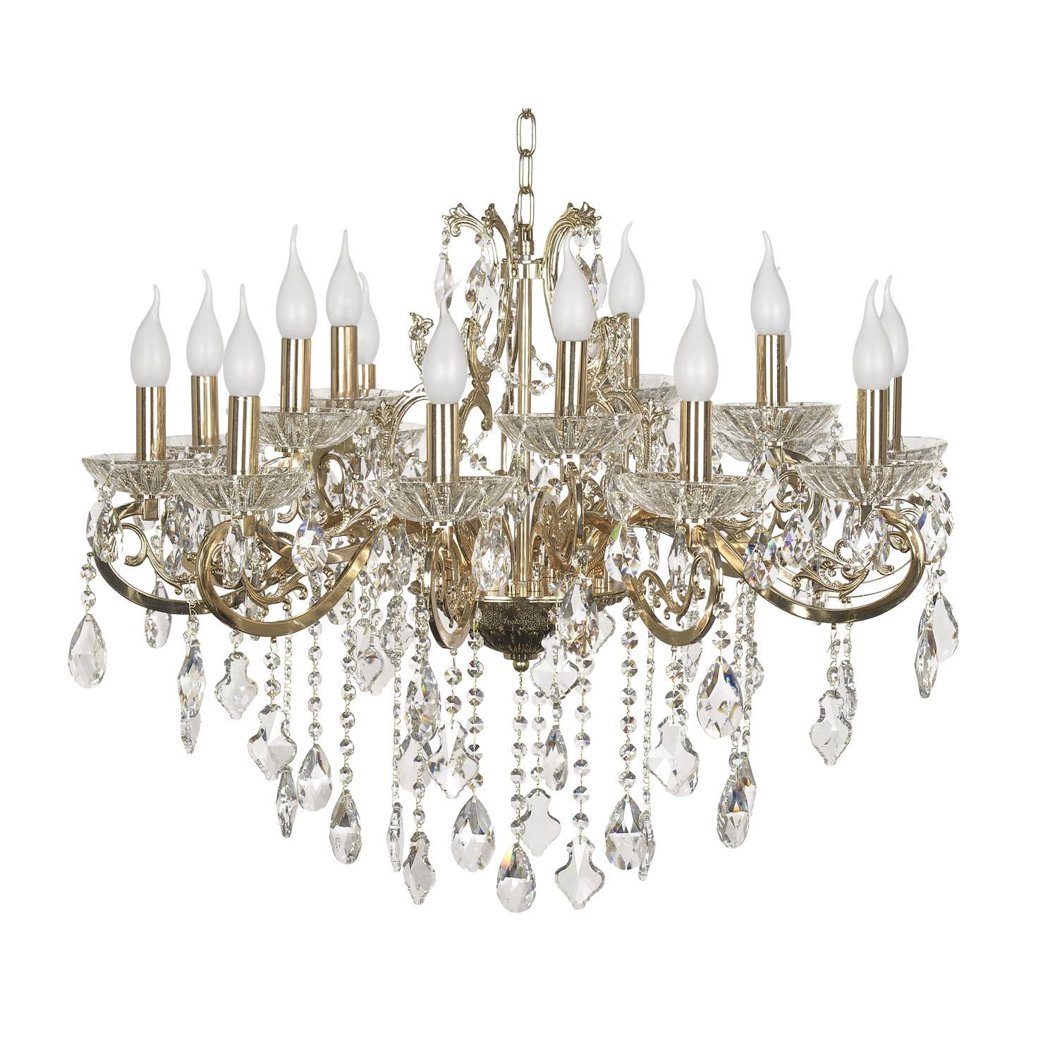 металла золотого цвета. Поверхность арматуры глянцевая. Плафон отсутствует. Декоративные элементы выполнены из прозрачного хрусталя. Осветительный прибор рассчитан на освещение пространства площадью 30 кв. м. Тип цоколя используемых ламп E14. Производитель рекомендует использовать лампы мощностью не более 40 Вт. Суммарная мощность светильника составляет 600 Вт. Лампочки в комплект не входят. Защита от попадания влаги и пыли внутрь изделия не предусмотрена. Рекомендуем к применению в гостиной, кабинете, спальне.