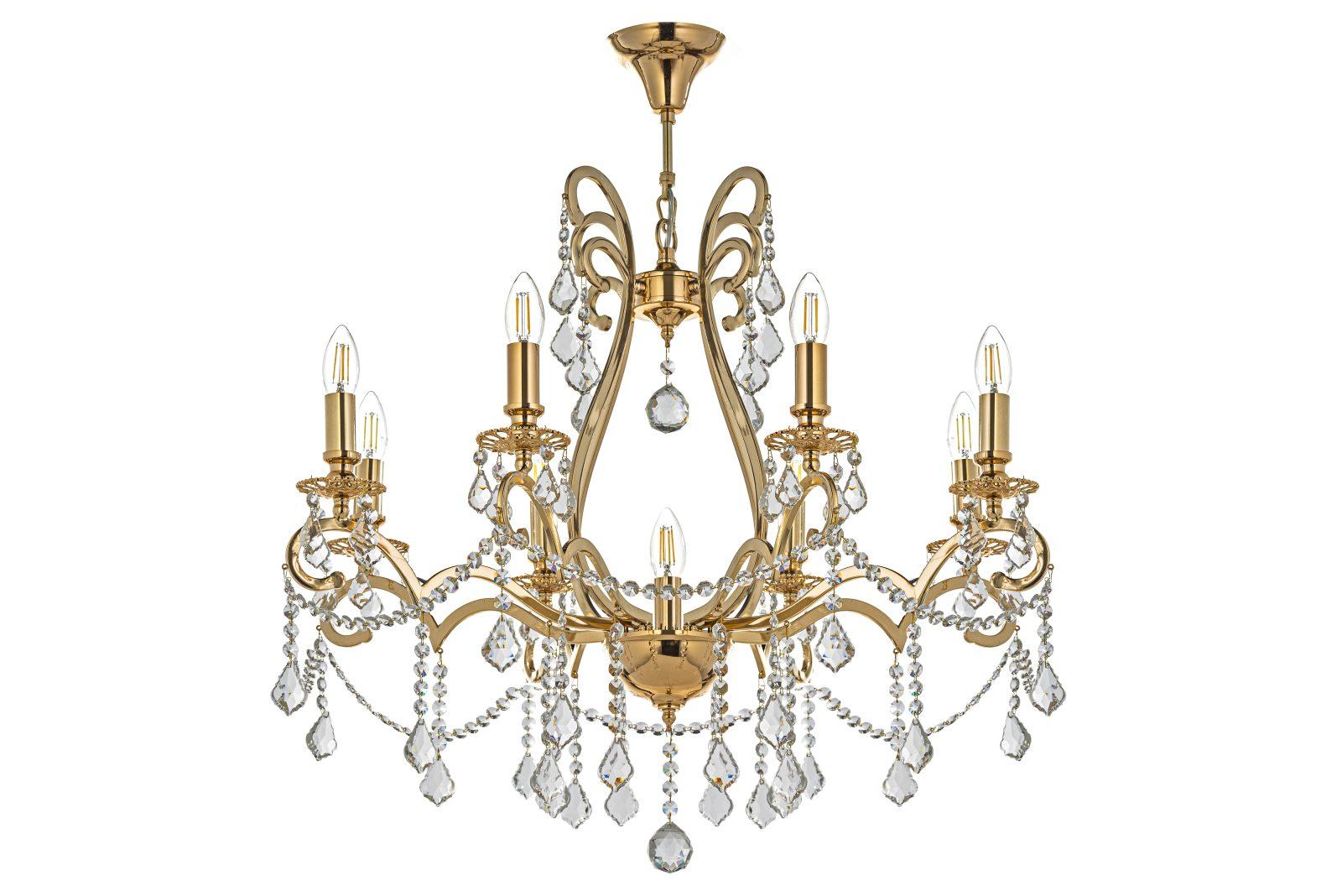 металла золотого цвета. Поверхность арматуры глянцевая. Плафон отсутствует. Декоративные элементы выполнены из прозрачного хрусталя. Осветительный прибор рассчитан на освещение пространства площадью 18 кв. м. Тип цоколя используемых ламп E14. Производитель рекомендует использовать лампы мощностью не более 40 Вт. Суммарная мощность светильника составляет 360 Вт. Лампочки в комплект не входят. Защита от попадания влаги и пыли внутрь изделия не предусмотрена. Рекомендуем к применению в гостиной, кабинете, спальне.