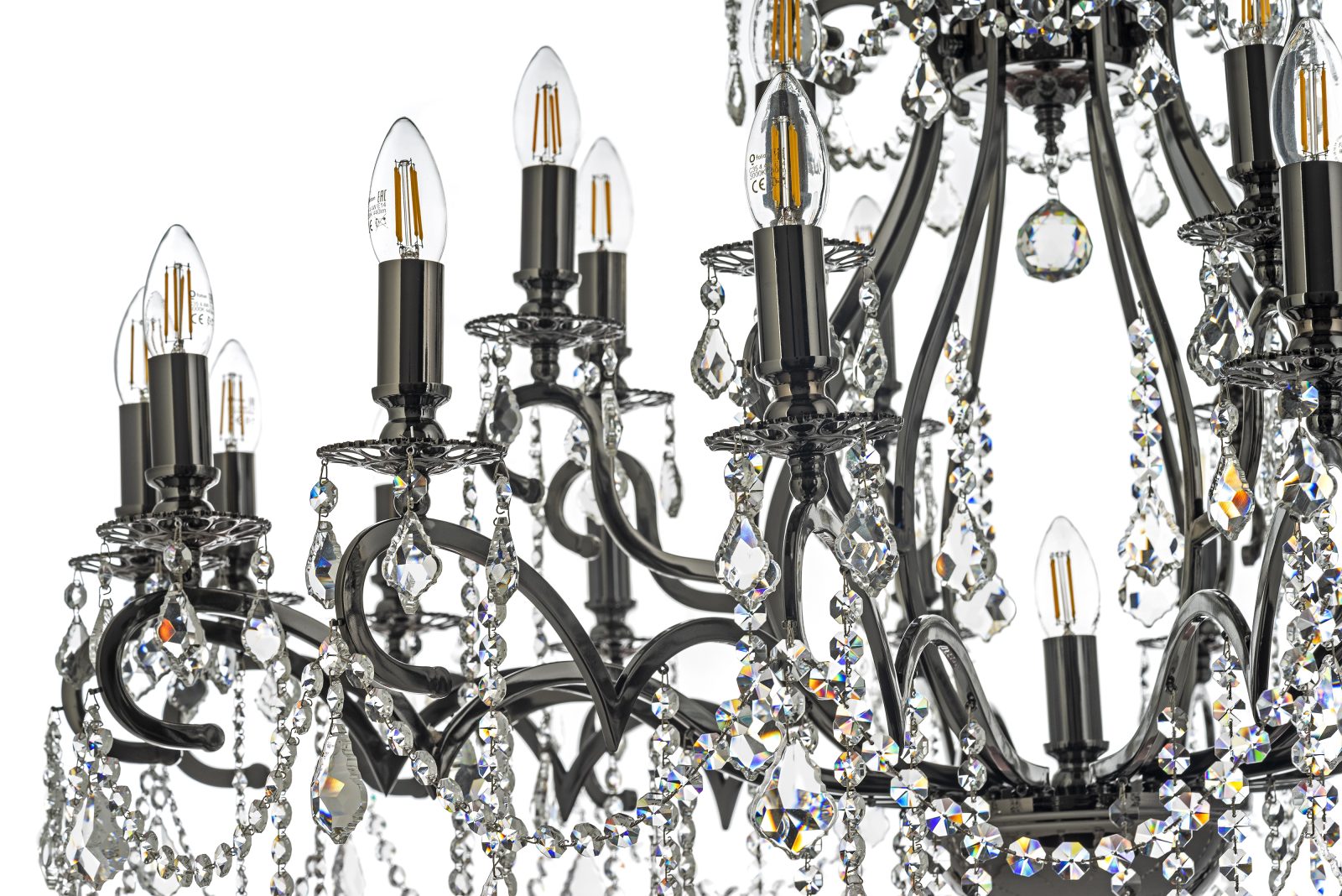 металла цвета никель с чернением. Поверхность арматуры глянцевая. Плафон отсутствует. Декоративные элементы выполнены из прозрачного хрусталя. Осветительный прибор рассчитан на освещение пространства площадью 48 кв. м. Тип цоколя используемых ламп E14. Производитель рекомендует использовать лампы мощностью не более 40 Вт. Суммарная мощность светильника составляет 960 Вт. Лампочки в комплект не входят. Защита от попадания влаги и пыли внутрь изделия не предусмотрена. Рекомендуем к применению в гостиной, кабинете, спальне.