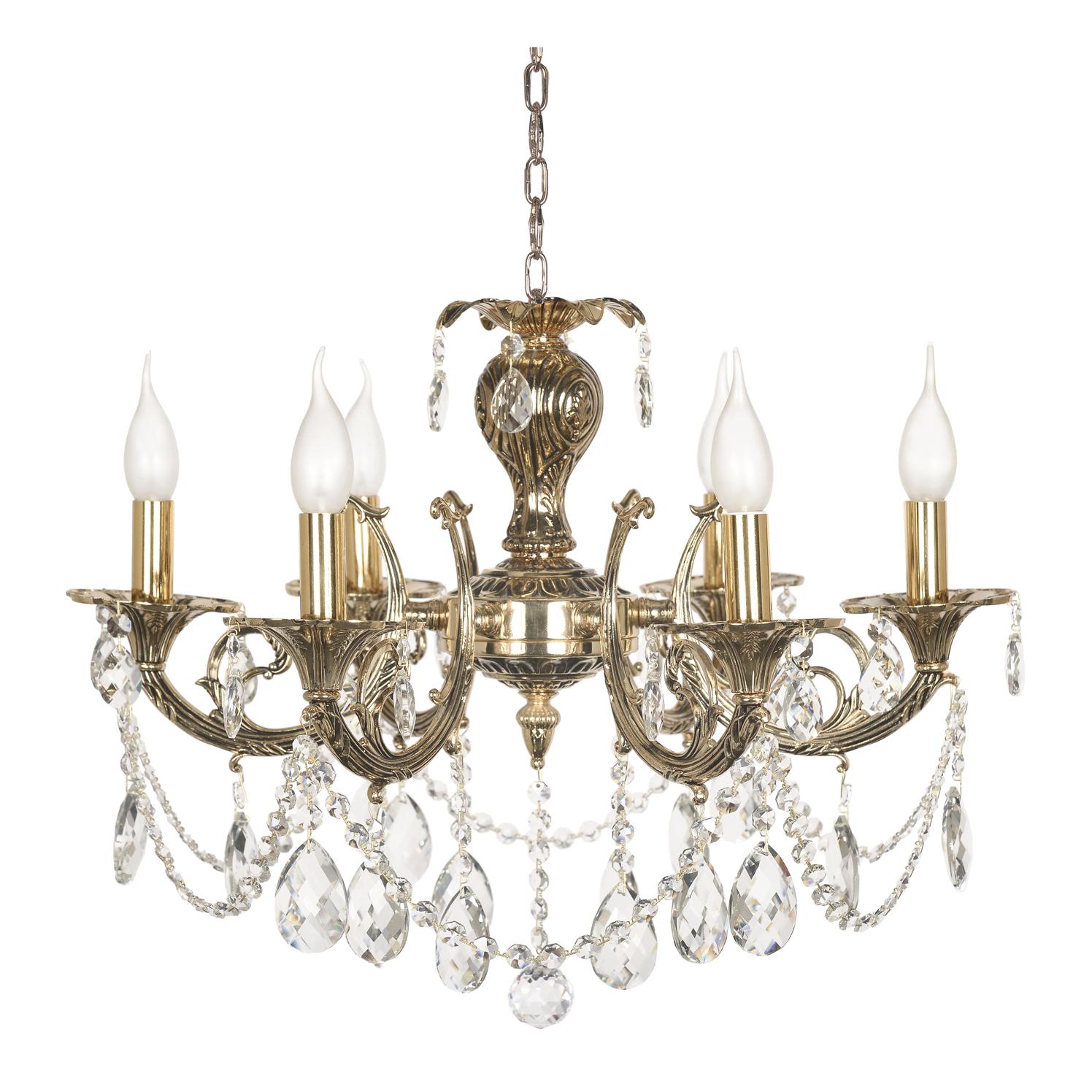 металла золотого цвета с чернением. Поверхность арматуры глянцевая и рельефная. Плафон отсутствует. Декоративные элементы выполнены из прозрачного хрусталя. Осветительный прибор рассчитан на освещение пространства площадью 12 кв. м. Тип цоколя используемых ламп E14. Производитель рекомендует использовать лампы мощностью не более 40 Вт. Суммарная мощность светильника составляет 240 Вт. Лампочки в комплект не входят. Защита от попадания влаги и пыли внутрь изделия не предусмотрена. Рекомендуем к применению в гостиной, кабинете, спальне.