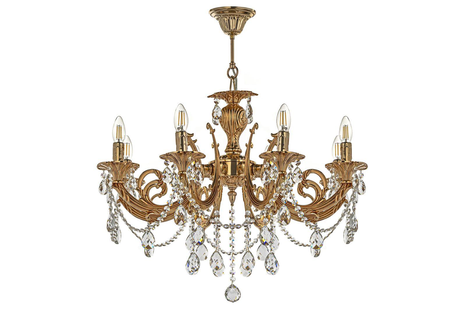металла золотого цвета с чернением. Поверхность арматуры глянцевая и рельефная. Плафон отсутствует. Декоративные элементы выполнены из прозрачного хрусталя. Осветительный прибор рассчитан на освещение пространства площадью 16 кв. м. Тип цоколя используемых ламп E14. Производитель рекомендует использовать лампы мощностью не более 40 Вт. Суммарная мощность светильника составляет 320 Вт. Лампочки в комплект не входят. Защита от попадания влаги и пыли внутрь изделия не предусмотрена. Рекомендуем к применению в гостиной, кабинете, спальне.