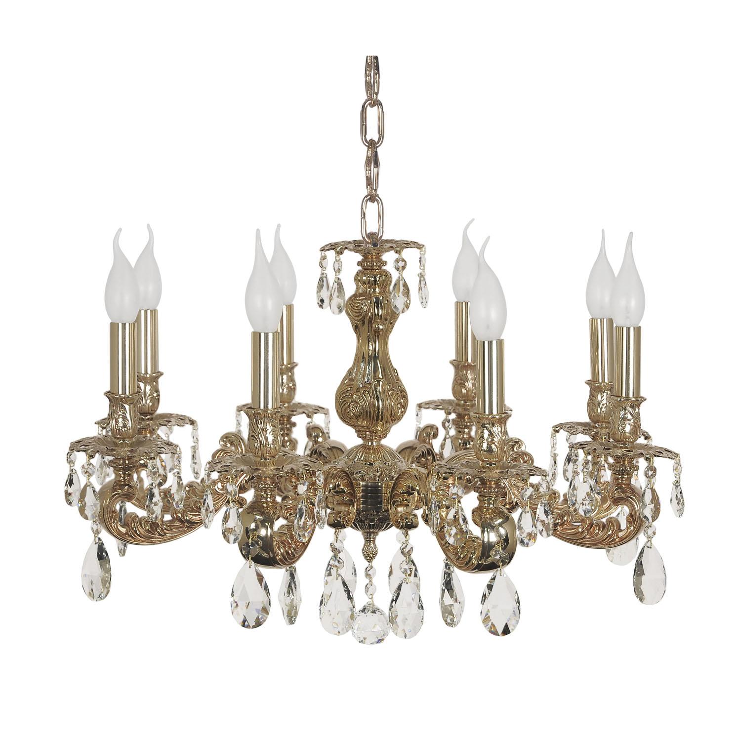 металла золотого цвета с патиной. Поверхность арматуры глянцевая. Плафон отсутствует. Декоративные элементы выполнены из прозрачного хрусталя. Осветительный прибор рассчитан на освещение пространства площадью 16 кв. м. Тип цоколя используемых ламп E14. Производитель рекомендует использовать лампы мощностью не более 40 Вт. Суммарная мощность светильника составляет 320 Вт. Лампочки в комплект не входят. Защита от попадания влаги и пыли внутрь изделия не предусмотрена. Рекомендуем к применению в гостиной, спальне, прихожей, кабинете.