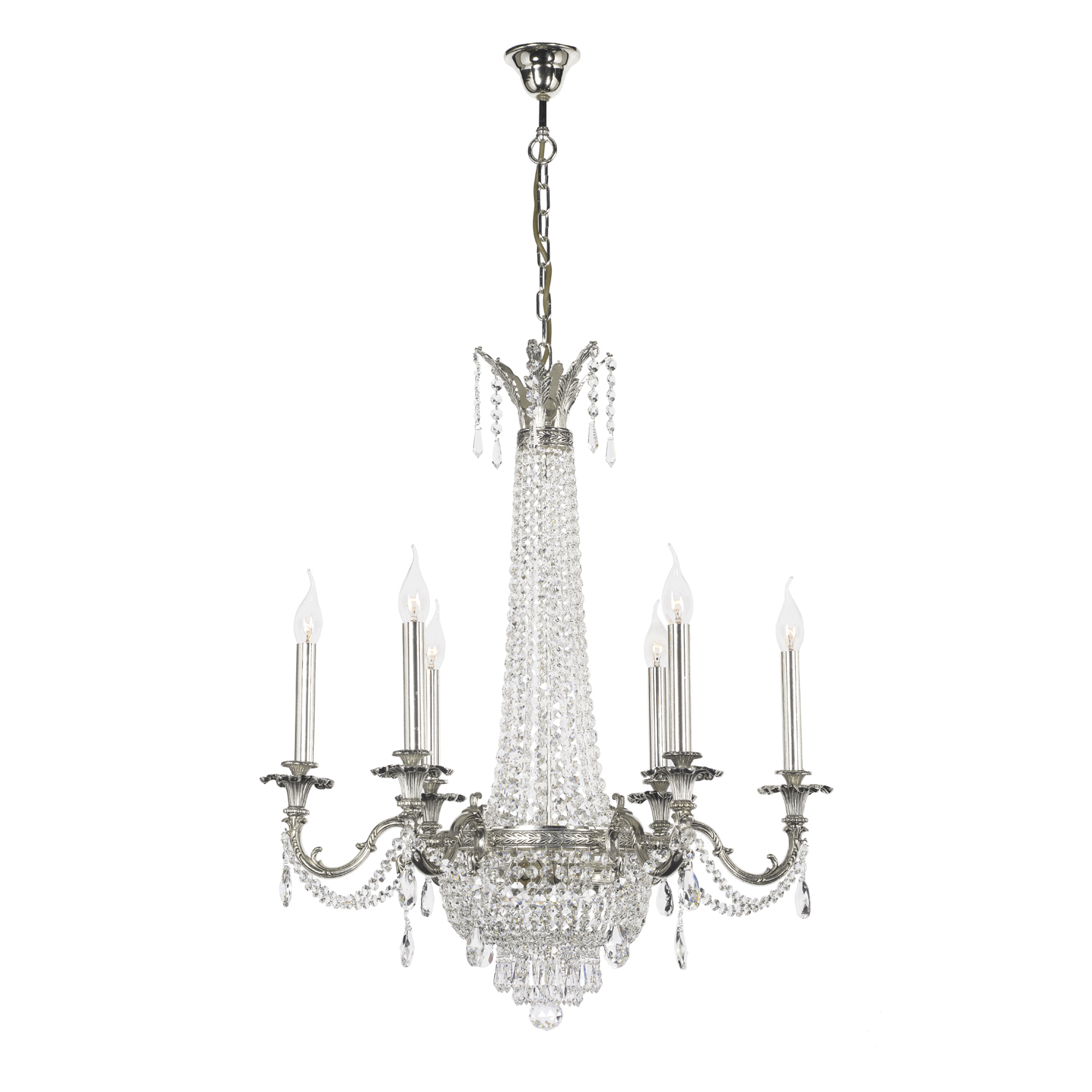 металла серебряного цвета с чернением. Поверхность арматуры глянцевая. Плафон отсутствует. Декоративные элементы выполнены из прозрачного хрусталя. Осветительный прибор рассчитан на освещение пространства площадью 13 кв. м. Тип цоколя используемых ламп E14. Производитель рекомендует использовать лампы мощностью не более 60 Вт. Суммарная мощность светильника составляет 264 Вт. Лампочки в комплект не входят. Защита от попадания влаги и пыли внутрь изделия не предусмотрена. Рекомендуем к применению в гостиной, кабинете, спальне.