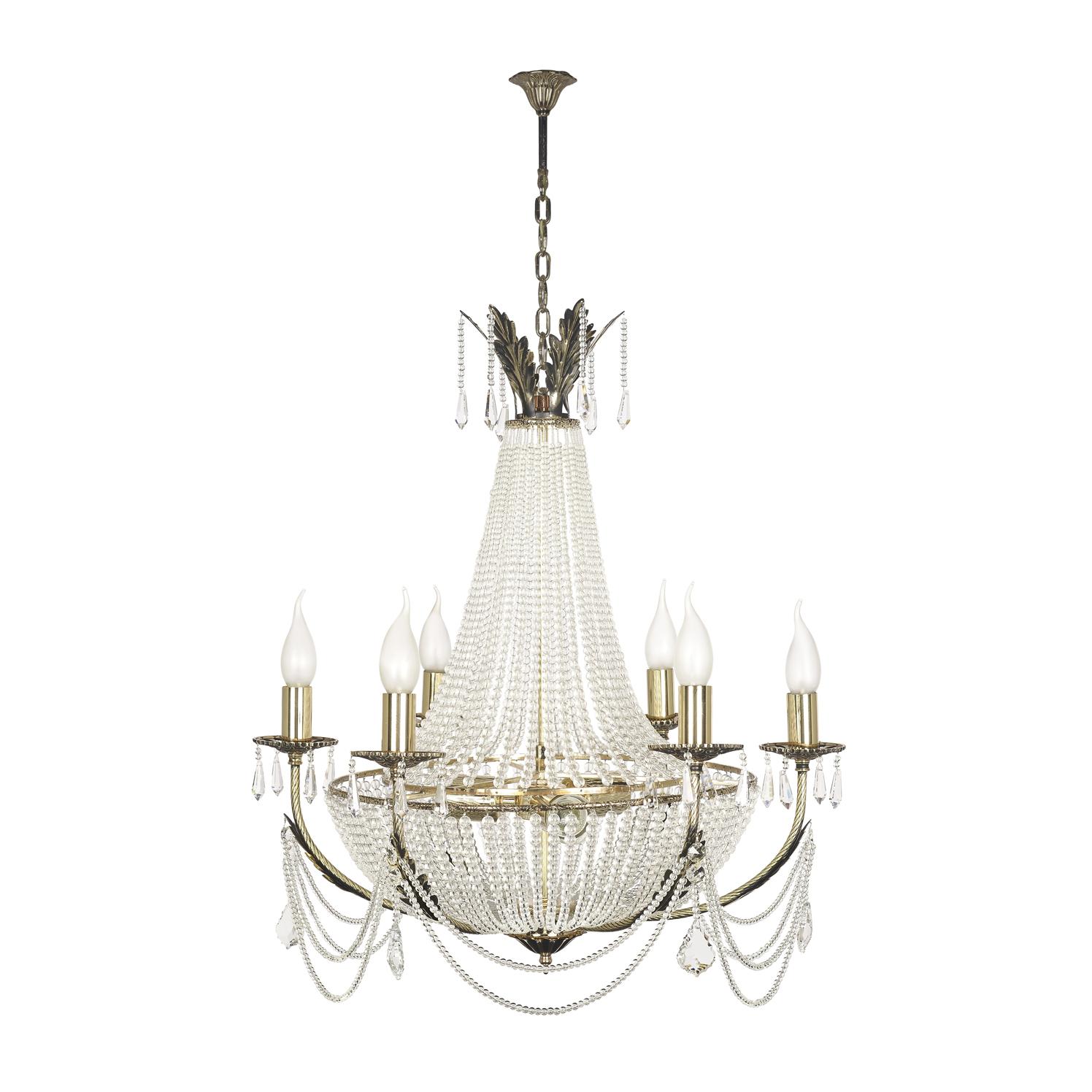 металла золотого цвета с патиной. Поверхность арматуры глянцевая. Плафон отсутствует. Декоративные элементы выполнены из прозрачного хрусталя. Осветительный прибор рассчитан на освещение пространства площадью 26 кв. м. Тип цоколя используемых ламп E14. Производитель рекомендует использовать лампы мощностью не более 60 Вт. Суммарная мощность светильника составляет 520 Вт. Лампочки в комплект не входят. Защита от попадания влаги и пыли внутрь изделия не предусмотрена. Рекомендуем к применению в гостиной, спальне, прихожей, кабинете.