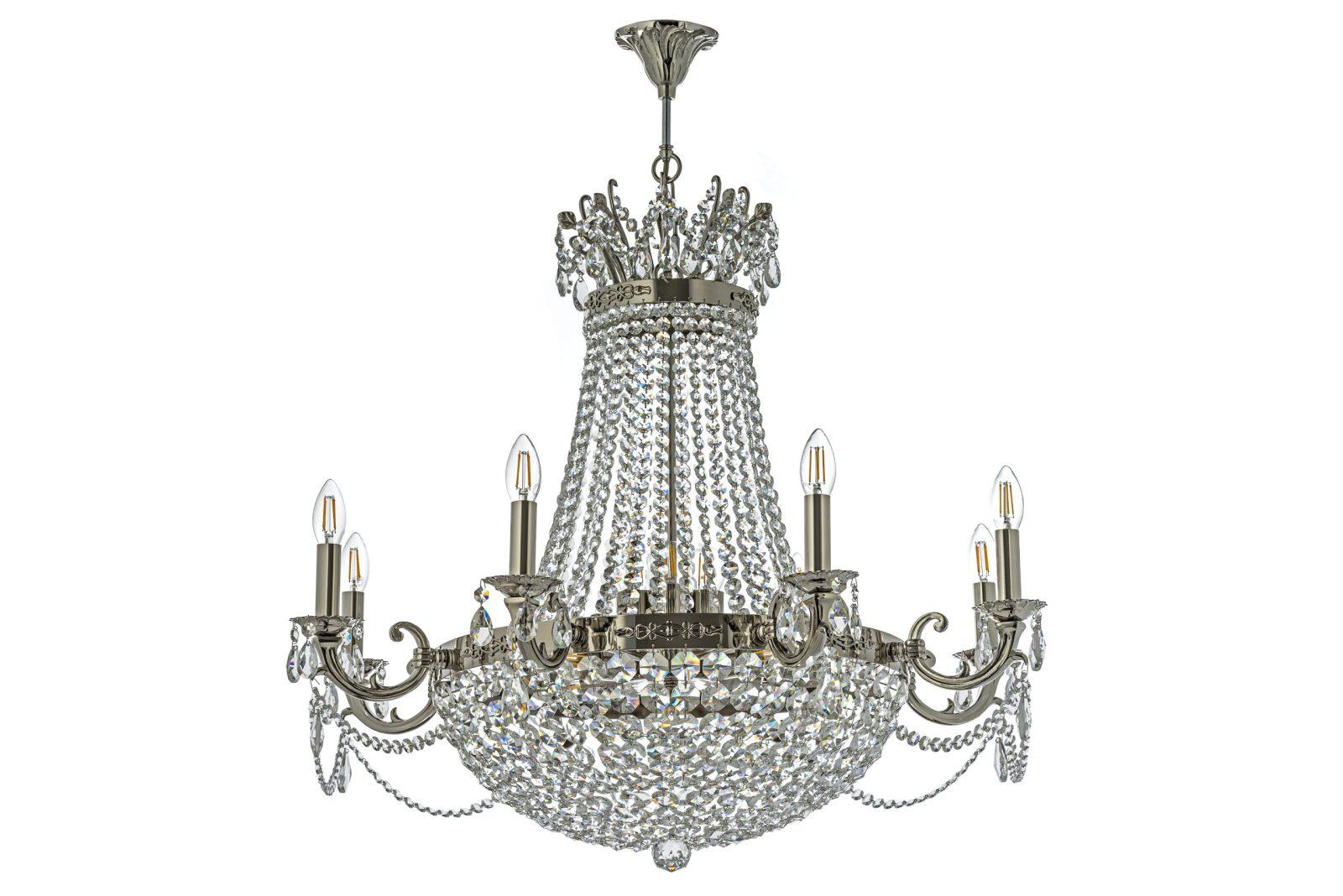 металла цвета никель. Поверхность арматуры матовая. Плафон изготовлен из хрусталя прозрачного цвета. с глянцевой поверхностью. Декоративные элементы выполнены из прозрачного хрусталя. Осветительный прибор рассчитан на освещение пространства площадью 16 кв. м. Тип цоколя используемых ламп E14. Производитель рекомендует использовать лампы мощностью не более 40 Вт. Суммарная мощность светильника составляет 320 Вт. Лампочки в комплект не входят. Защита от попадания влаги и пыли внутрь изделия не предусмотрена. Рекомендуем к применению в гостиной, кабинете, спальне.