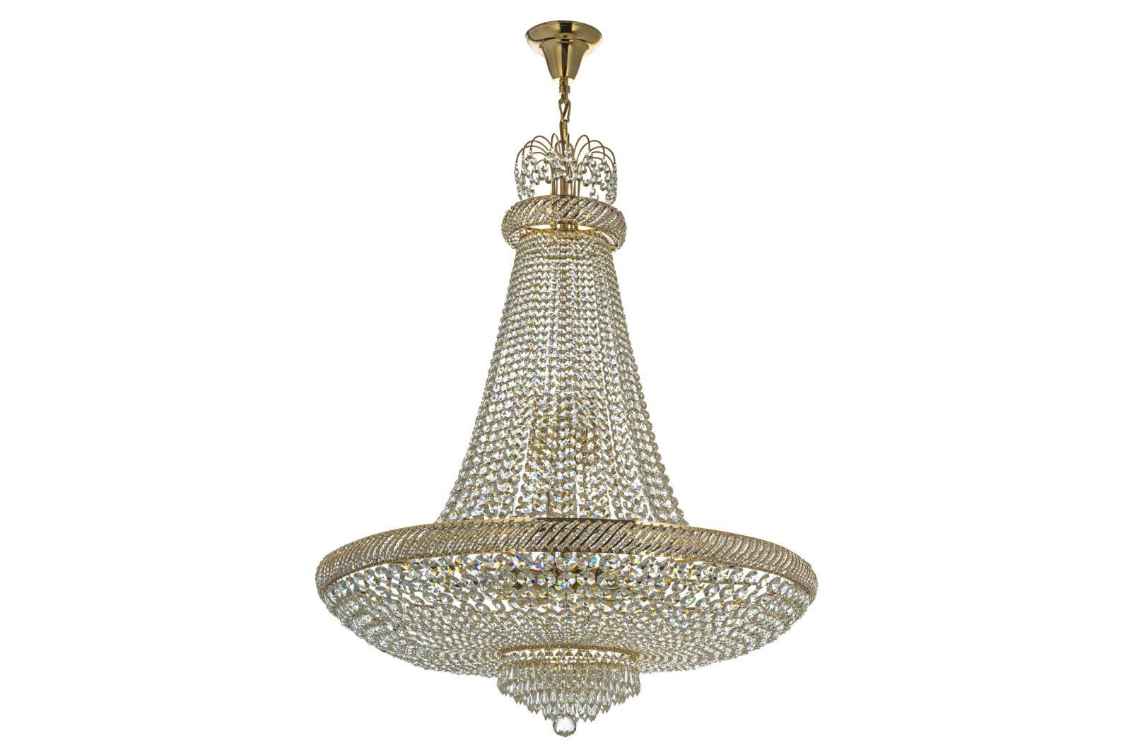 металла золотого цвета. Поверхность арматуры глянцевая. Плафон изготовлен из хрусталя прозрачного цвета. с глянцевой поверхностью. Декоративные элементы выполнены из прозрачного хрусталя. Осветительный прибор рассчитан на освещение пространства площадью 36 кв. м. Тип цоколя используемых ламп E27. Производитель рекомендует использовать лампы мощностью не более 60 Вт. Суммарная мощность светильника составляет 720 Вт. Лампочки в комплект не входят. Защита от попадания влаги и пыли внутрь изделия не предусмотрена. Рекомендуем к применению в гостиной, кабинете, спальне.