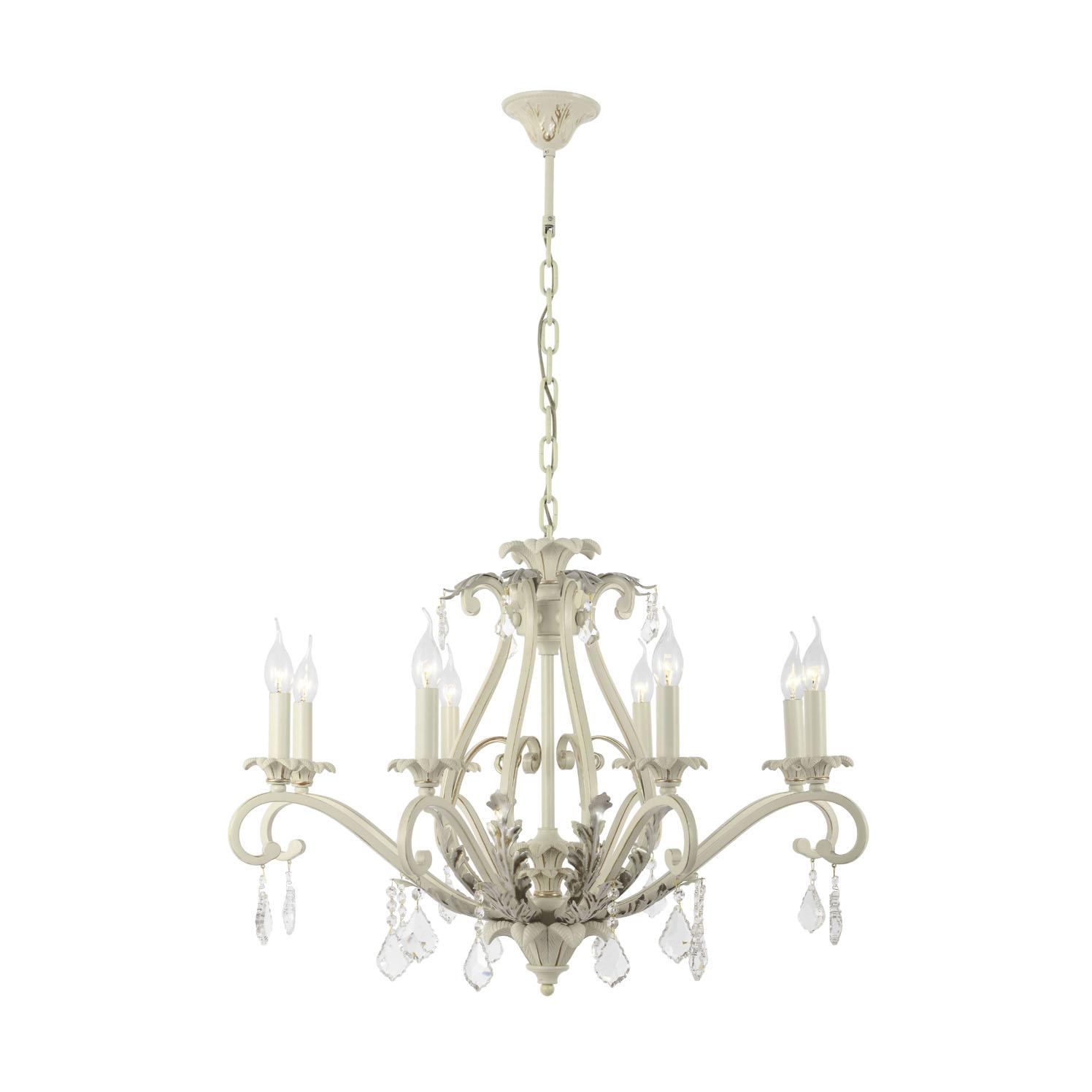 металла белого цвета. Поверхность арматуры матовая. Плафон отсутствует. Лампы направленывверх. Декоративные элементы выполнены из прозрачного хрусталя. Осветительный прибор рассчитан на освещение пространства площадью 16 кв. м. Тип цоколя используемых ламп E14. Производитель рекомендует использовать лампы мощностью не более 40 Вт. Суммарная мощность светильника составляет 320 Вт. Лампочки в комплект не входят. Защита от попадания влаги и пыли внутрь изделия не предусмотрена. Рекомендуем к применению в гостиной, кабинете, спальне.