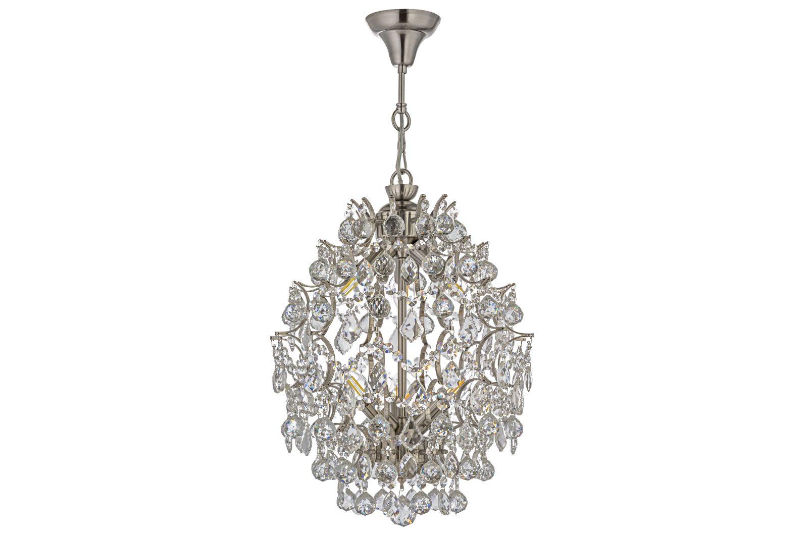 металла цвета никель. Поверхность арматуры матовая, рельефная. Плафон изготовлен из хрусталя прозрачного цвета, имеет форму колокола и матовую поверхность. Направлен вверх. Декоративные элементы выполнены из прозрачного хрусталя. Осветительный прибор рассчитан на освещение пространства площадью 12 кв. м. Тип цоколя используемых ламп E14. Производитель рекомендует использовать лампы мощностью не более 40 Вт. Суммарная мощность светильника составляет 240 Вт. Лампочки в комплект не входят. Защита от попадания влаги и пыли внутрь изделия не предусмотрена. Рекомендуем к применению в гостиной, кабинете, спальне.