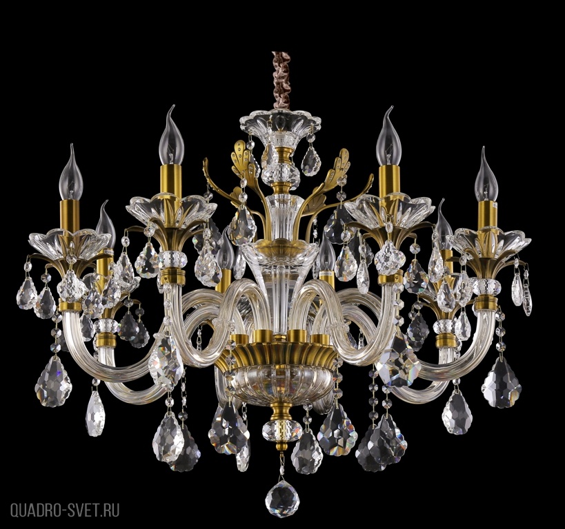 стекла и металла бронзового и прозрачного цветов. Поверхность арматуры глянцевая. Плафон отсутствует. Декоративные элементы выполнены из прозрачного хрусталя. Осветительный прибор рассчитан на освещение пространства площадью 24 кв. м. Тип цоколя используемых ламп E14. Производитель рекомендует использовать лампы мощностью не более 60 Вт. Суммарная мощность светильника составляет 480 Вт. Лампочки в комплект не входят. Защита от попадания влаги и пыли внутрь изделия не предусмотрена. Рекомендуем к применению в гостиной, спальне, прихожей, кабинете.