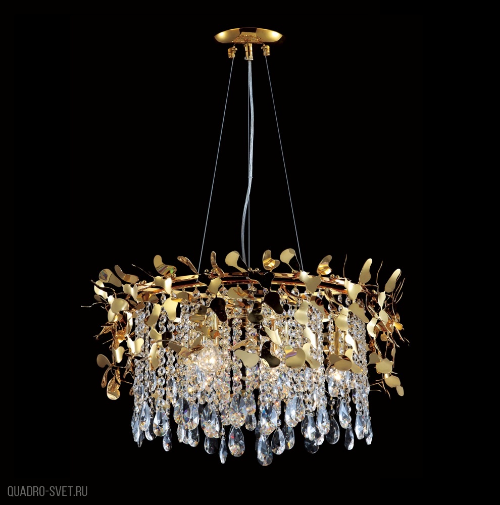 металла золотого цвета. Поверхность арматуры глянцевая. Плафон изготовлен из металла золотого цвета. Декоративные элементы выполнены из прозрачного хрусталя. Осветительный прибор рассчитан на освещение пространства площадью 18 кв. м. Тип цоколя используемых ламп E14. Производитель рекомендует использовать лампы мощностью не более 60 Вт. Суммарная мощность светильника составляет 360 Вт. Лампочки в комплект не входят. Защита от попадания влаги и пыли внутрь изделия не предусмотрена. Рекомендуем к применению в гостиной, спальне, прихожей, кабинете.