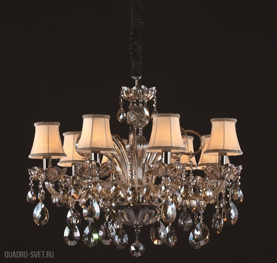 стекла и металла коньячного и графитового цветов. Поверхность арматуры глянцевая. Плафон изготовлен из текстиля бежевого цвета. Декоративные элементы выполнены из хрусталя коньячного цвета. Осветительный прибор рассчитан на освещение пространства площадью 16 кв. м. Тип цоколя используемых ламп E14. Производитель рекомендует использовать лампы мощностью не более 40 Вт. Суммарная мощность светильника составляет 320 Вт. Лампочки в комплект не входят. Защита от попадания влаги и пыли внутрь изделия не предусмотрена. Рекомендуем к применению в гостиной, спальне, прихожей, кабинете.