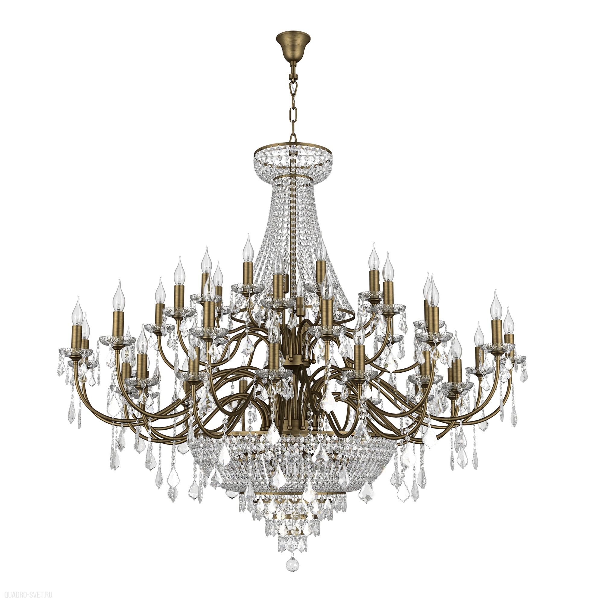 металла бронзового цвета. Поверхность арматуры матовая. Плафон изготовлен из хрусталя прозрачного цвета. с глянцевой поверхностью. Декоративные элементы выполнены из прозрачного хрусталя. Осветительный прибор рассчитан на освещение пространства площадью 153 кв. м. Тип цоколя используемых ламп E14. Производитель рекомендует использовать лампы мощностью не более 60 Вт. Суммарная мощность светильника составляет 3060 Вт. Лампочки в комплект не входят. Защита от попадания влаги и пыли внутрь изделия не предусмотрена. Рекомендуем к применению в гостиной, кабинете, спальне.