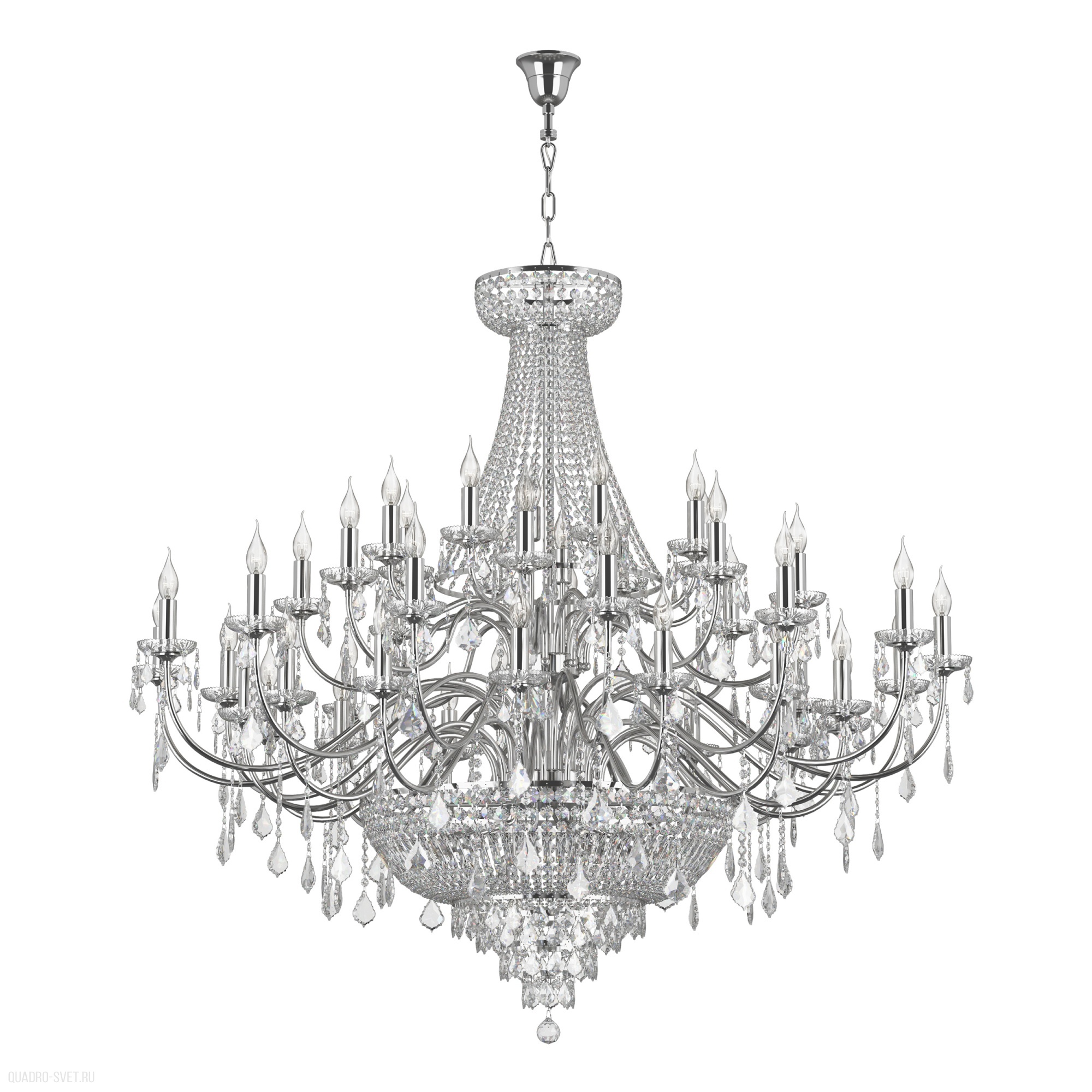 металла цвета хром. Поверхность арматуры глянцевая. Плафон изготовлен из хрусталя прозрачного цвета. с глянцевой поверхностью. Декоративные элементы выполнены из прозрачного хрусталя. Осветительный прибор рассчитан на освещение пространства площадью 153 кв. м. Тип цоколя используемых ламп E14. Производитель рекомендует использовать лампы мощностью не более 60 Вт. Суммарная мощность светильника составляет 3060 Вт. Лампочки в комплект не входят. Защита от попадания влаги и пыли внутрь изделия не предусмотрена. Рекомендуем к применению в гостиной, кабинете, спальне.