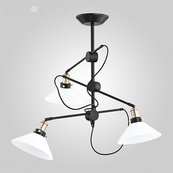 металла черного цвета. Поверхность арматуры глянцевая. Плафон изготовлен из стекла белого цвета, имеет конусную форму и прозрачную поверхность. Направлен вниз. Осветительный прибор рассчитан на освещение пространства площадью 14 кв. м. Тип цоколя используемых ламп E27. Производитель рекомендует использовать лампы мощностью не более 60 Вт. Суммарная мощность светильника составляет 180 Вт. Лампочки в комплект не входят. Защита от попадания влаги и пыли внутрь изделия не предусмотрена. Рекомендуем к применению в гостиной, кабинете, прихожей, спальне.