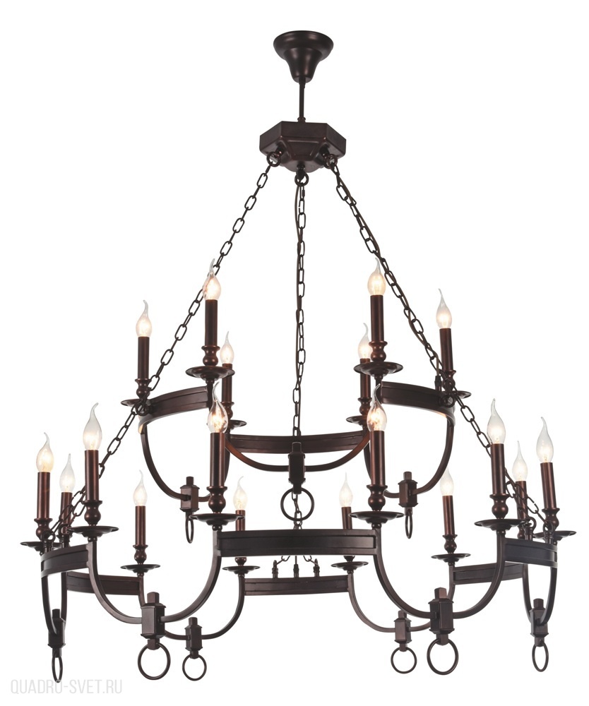 металла тёмно-коричневого цвета. Поверхность арматуры глянцевая. Плафон отсутствует. Осветительный прибор рассчитан на освещение пространства площадью 54 кв. м. Тип цоколя используемых ламп E14. Производитель рекомендует использовать лампы мощностью не более 60 Вт. Суммарная мощность светильника составляет 1080 Вт. Лампочки в комплект не входят. Защита от попадания влаги и пыли внутрь изделия не предусмотрена. Рекомендуем к применению в гостиной, спальне, прихожей, кабинете.
