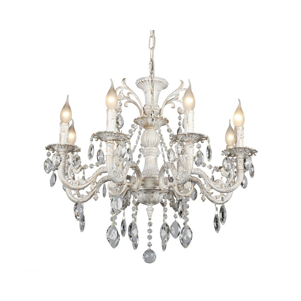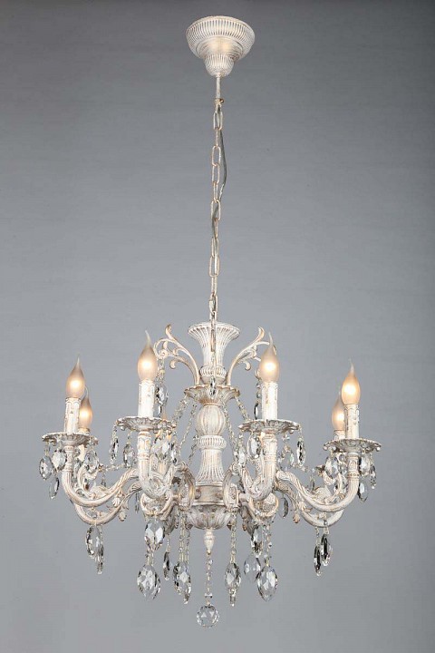 металла белого цвета с золотой патиной. Поверхность арматуры глянцевая и рельефная. Плафон отсутствует. Декоративные элементы выполнены из прозрачного хрусталя. Осветительный прибор рассчитан на освещение пространства площадью 24 кв. м. Тип цоколя используемых ламп E14. Производитель рекомендует использовать лампы мощностью не более 60 Вт. Суммарная мощность светильника составляет 480 Вт. Лампочки в комплект не входят. Защита от попадания влаги и пыли внутрь изделия не предусмотрена. Рекомендуем к применению в гостиной, кабинете, спальне.
