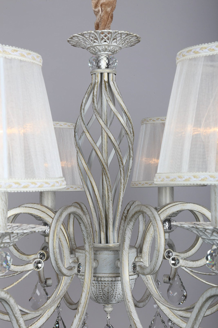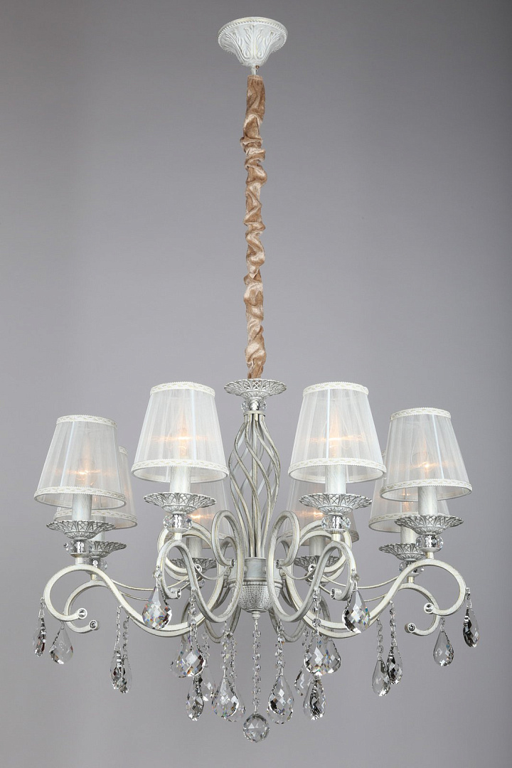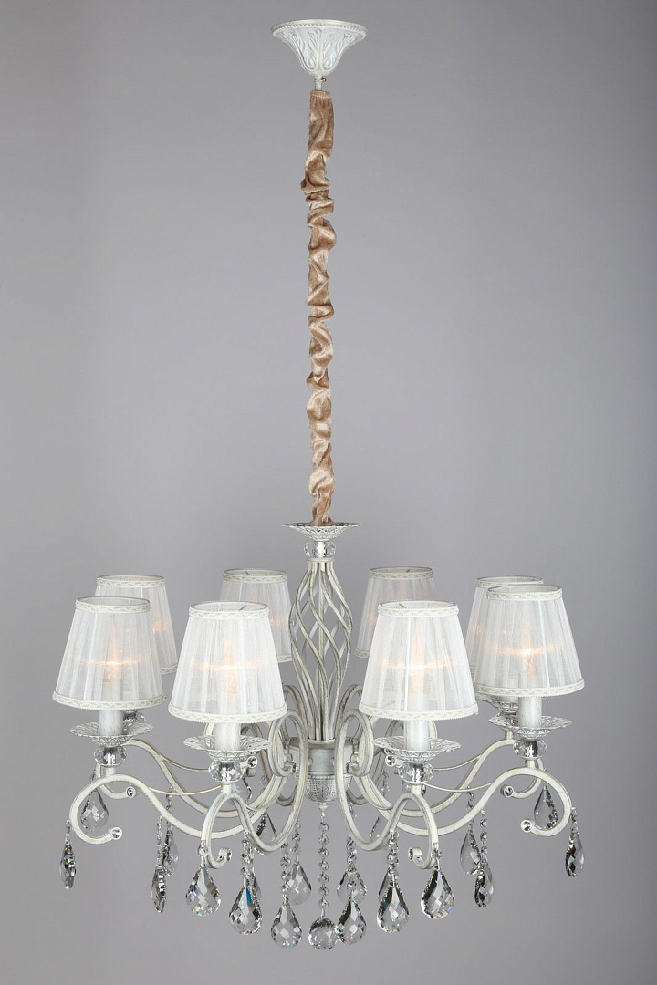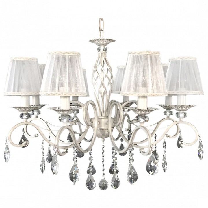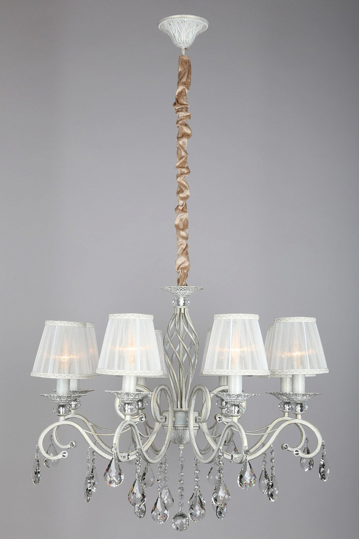 металла белого цвета с золотой патиной. Поверхность арматуры глянцевая. Плафон изготовлен из текстиля белого цвета с матовой каймой, имеет конусную форму и прозрачную поверхность. Направлен вверх и вниз. Декоративные элементы выполнены из прозрачного хрусталя. Осветительный прибор рассчитан на освещение пространства площадью 24 кв. м. Тип цоколя используемых ламп E14. Производитель рекомендует использовать лампы мощностью не более 60 Вт. Суммарная мощность светильника составляет 480 Вт. Лампочки в комплект не входят. Защита от попадания влаги и пыли внутрь изделия не предусмотрена. Рекомендуем к применению в гостиной, кабинете, спальне.