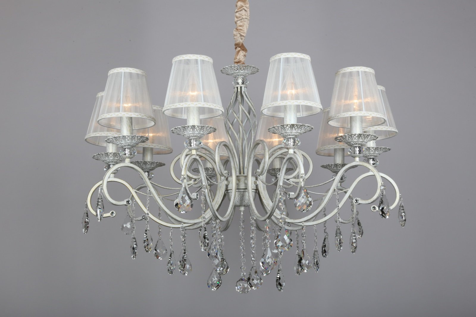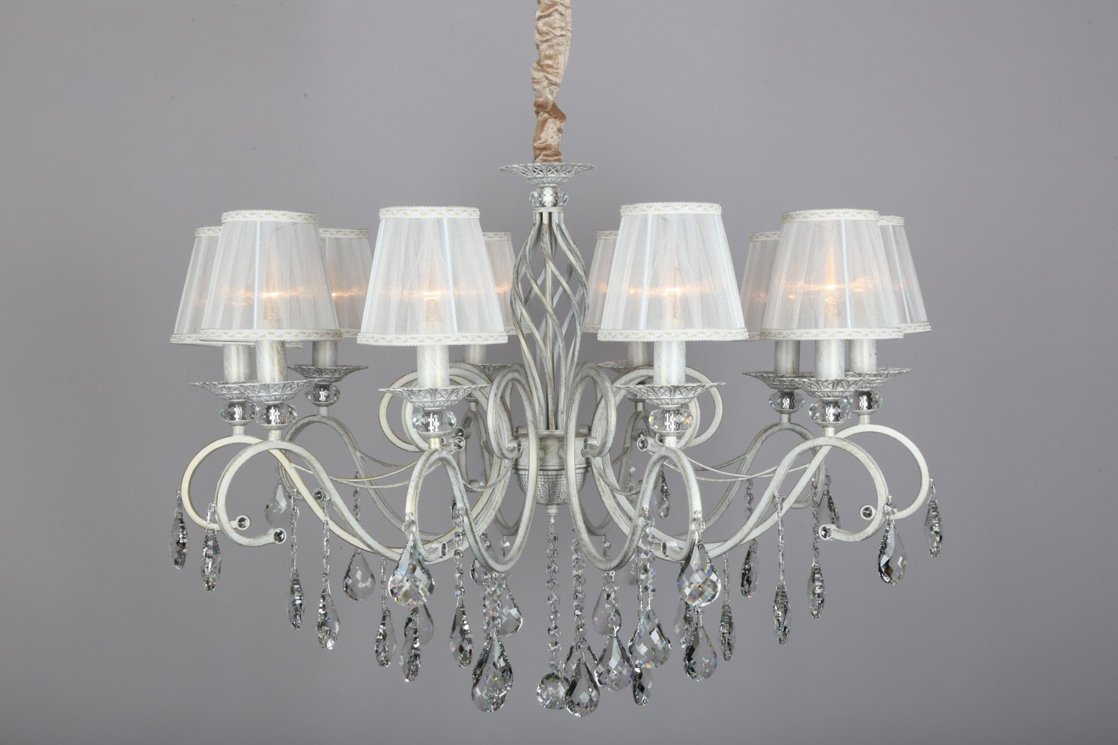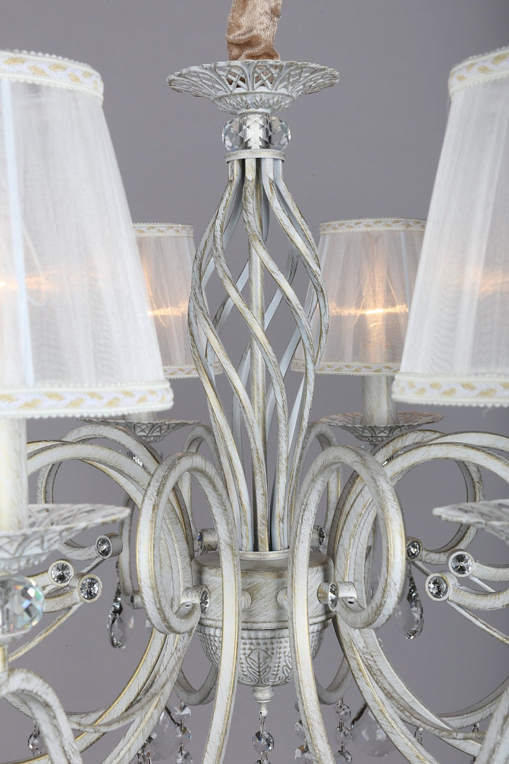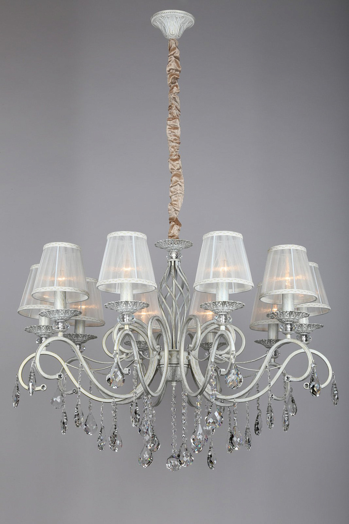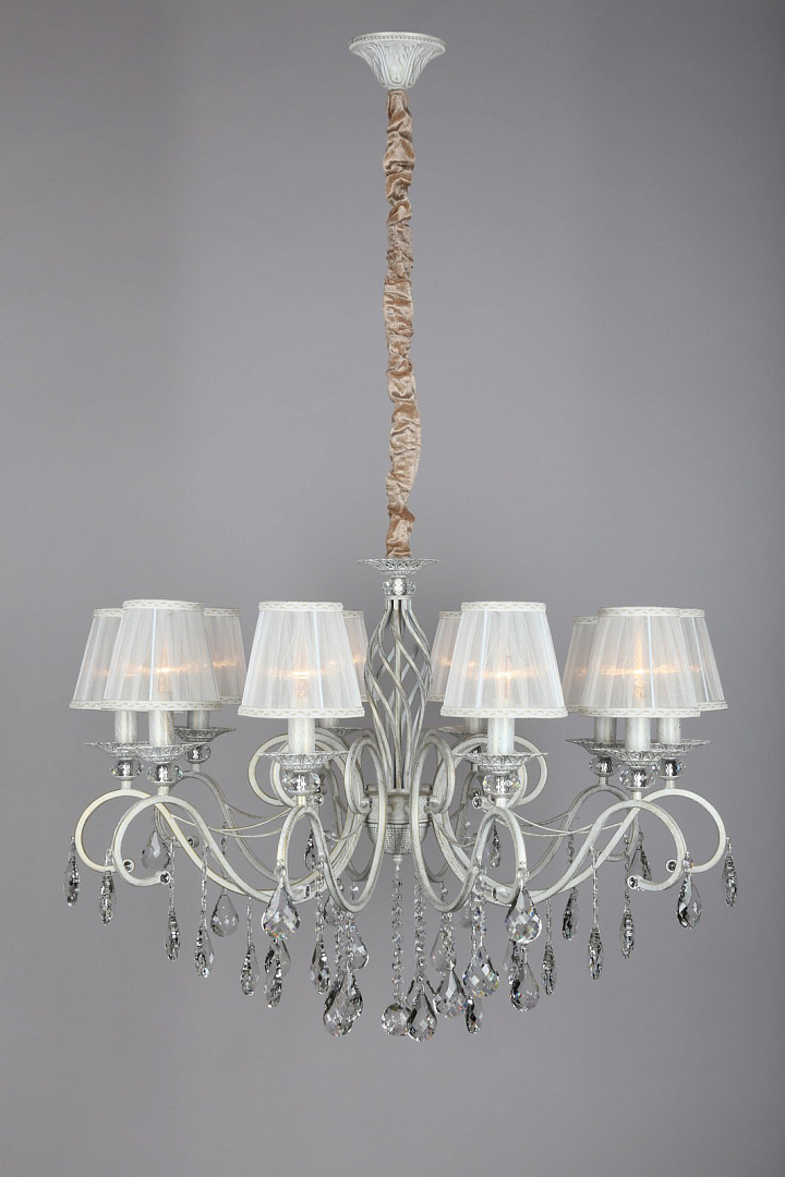 металла белого цвета с золотой патиной. Поверхность арматуры глянцевая. Плафон изготовлен из текстиля белого цвета с матовой каймой, имеет конусную форму и прозрачную поверхность. Направлен вверх и вниз. Декоративные элементы выполнены из прозрачного хрусталя. Осветительный прибор рассчитан на освещение пространства площадью 30 кв. м. Тип цоколя используемых ламп E14. Производитель рекомендует использовать лампы мощностью не более 60 Вт. Суммарная мощность светильника составляет 600 Вт. Лампочки в комплект не входят. Защита от попадания влаги и пыли внутрь изделия не предусмотрена. Рекомендуем к применению в гостиной, кабинете, спальне.