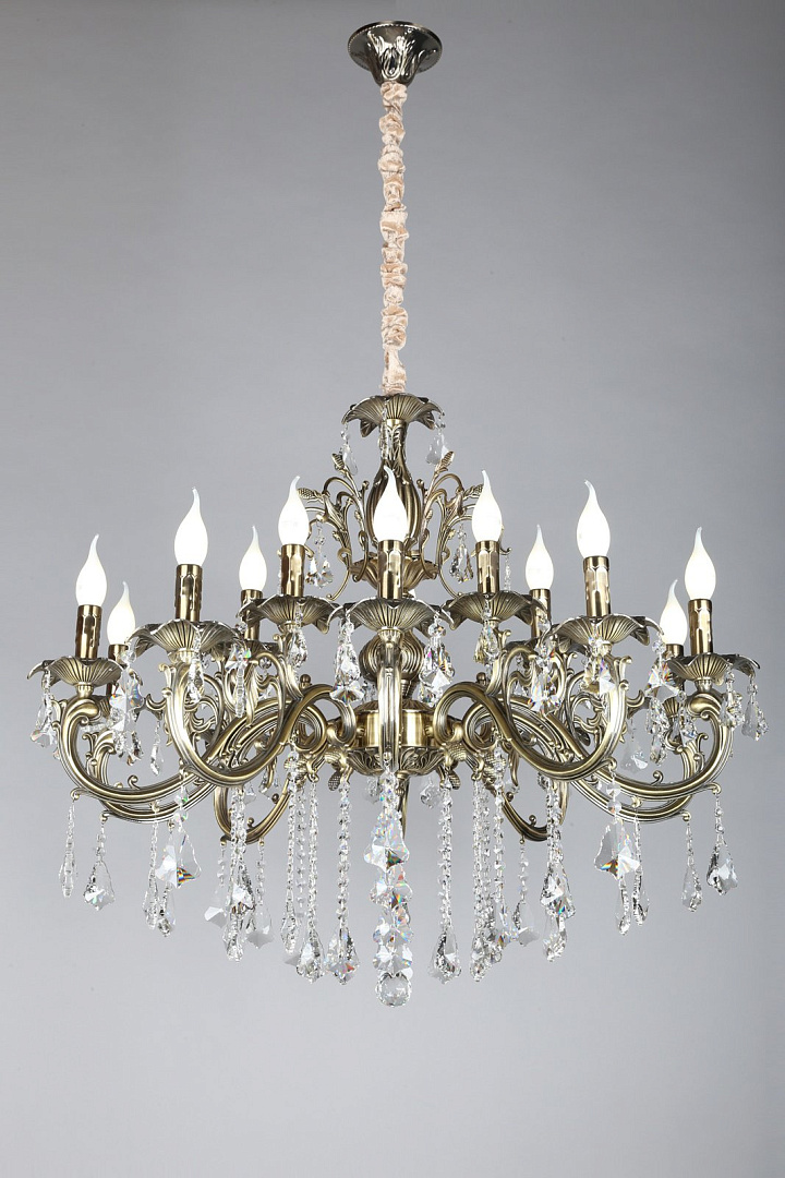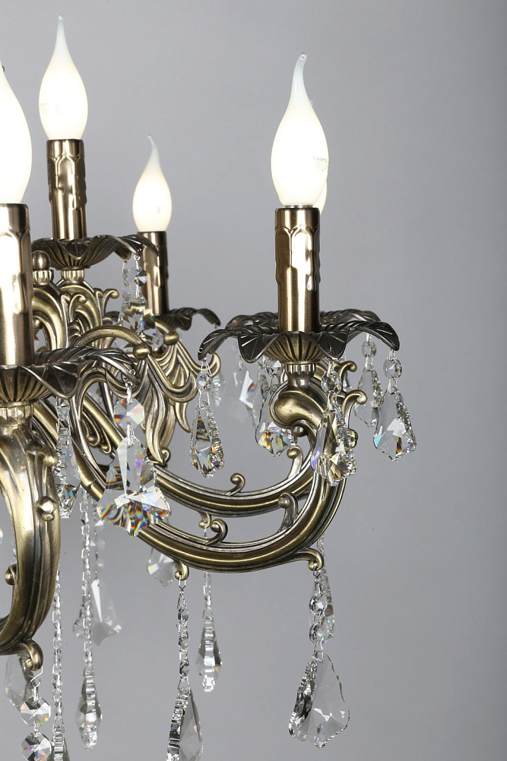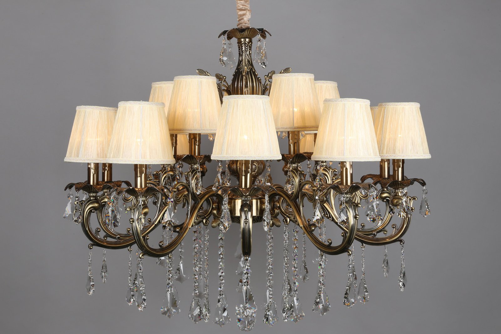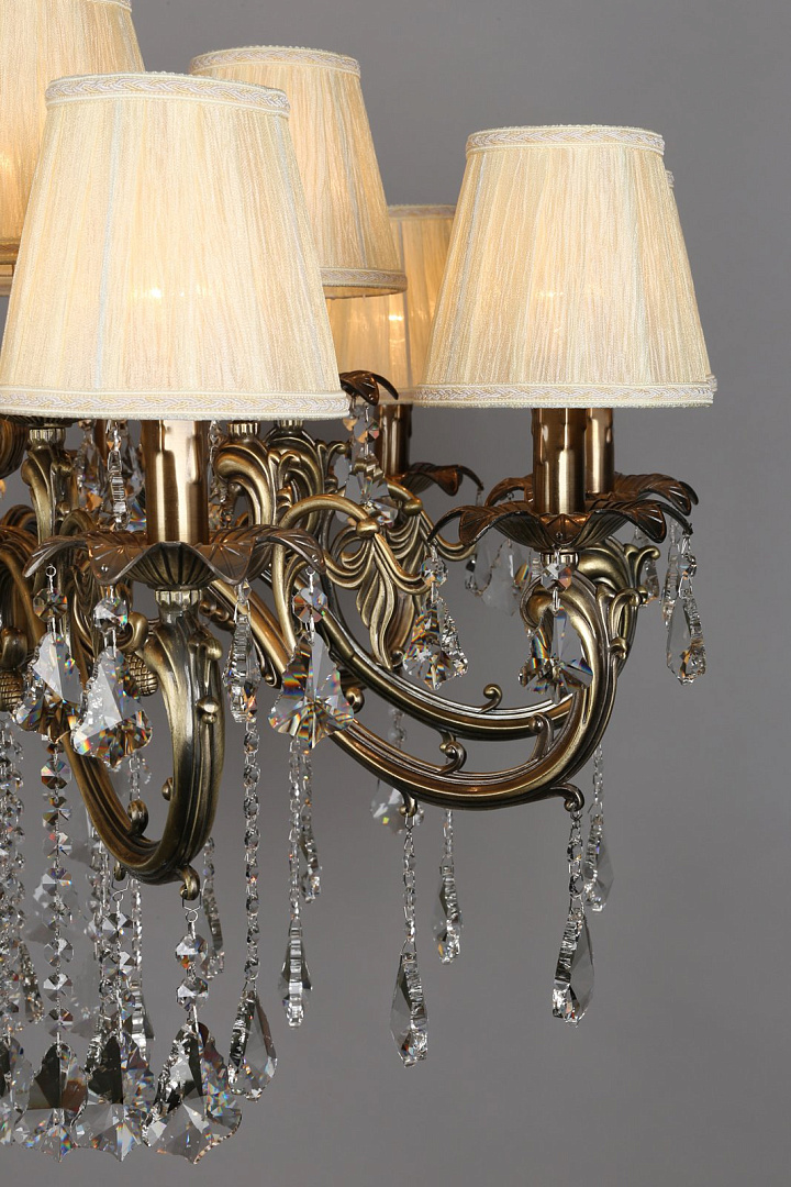 металла бронзового цвета. Поверхность арматуры глянцевая и рельефная. Плафон изготовлен из текстиля бежевого цвета, имеет конусную форму и матовую рельефную поверхность. Направлен вверх и вниз. Декоративные элементы выполнены из прозрачного хрусталя. Осветительный прибор рассчитан на освещение пространства площадью 30 кв. м. Тип цоколя используемых ламп E14. Производитель рекомендует использовать лампы мощностью не более 40 Вт. Суммарная мощность светильника составляет 600 Вт. Лампочки в комплект не входят. Защита от попадания влаги и пыли внутрь изделия не предусмотрена. Рекомендуем к применению в гостиной, кабинете, спальне.