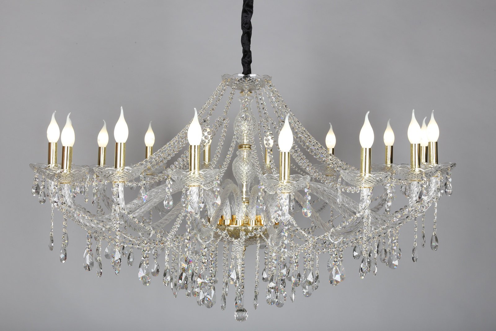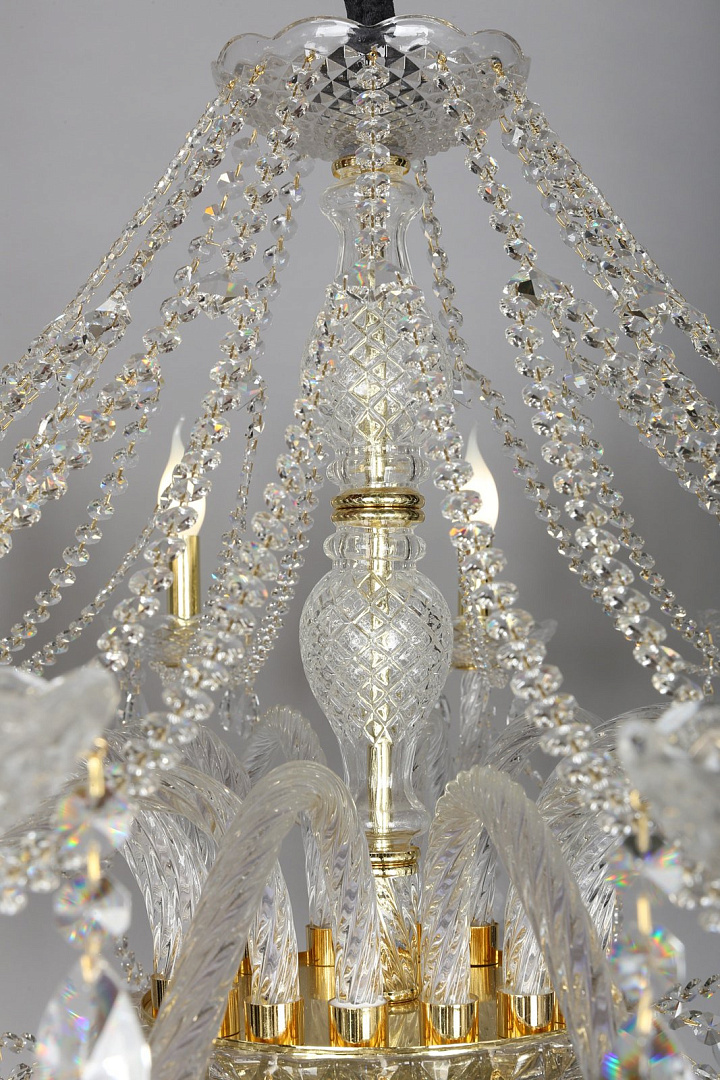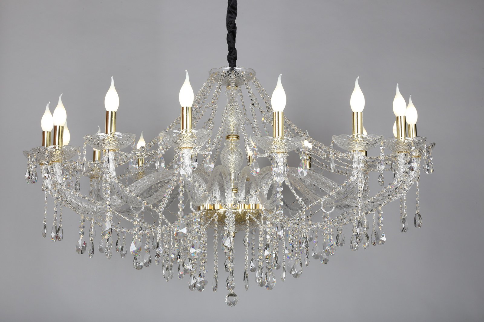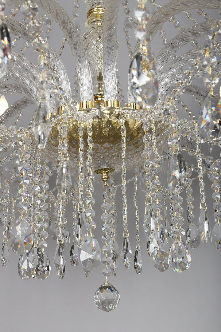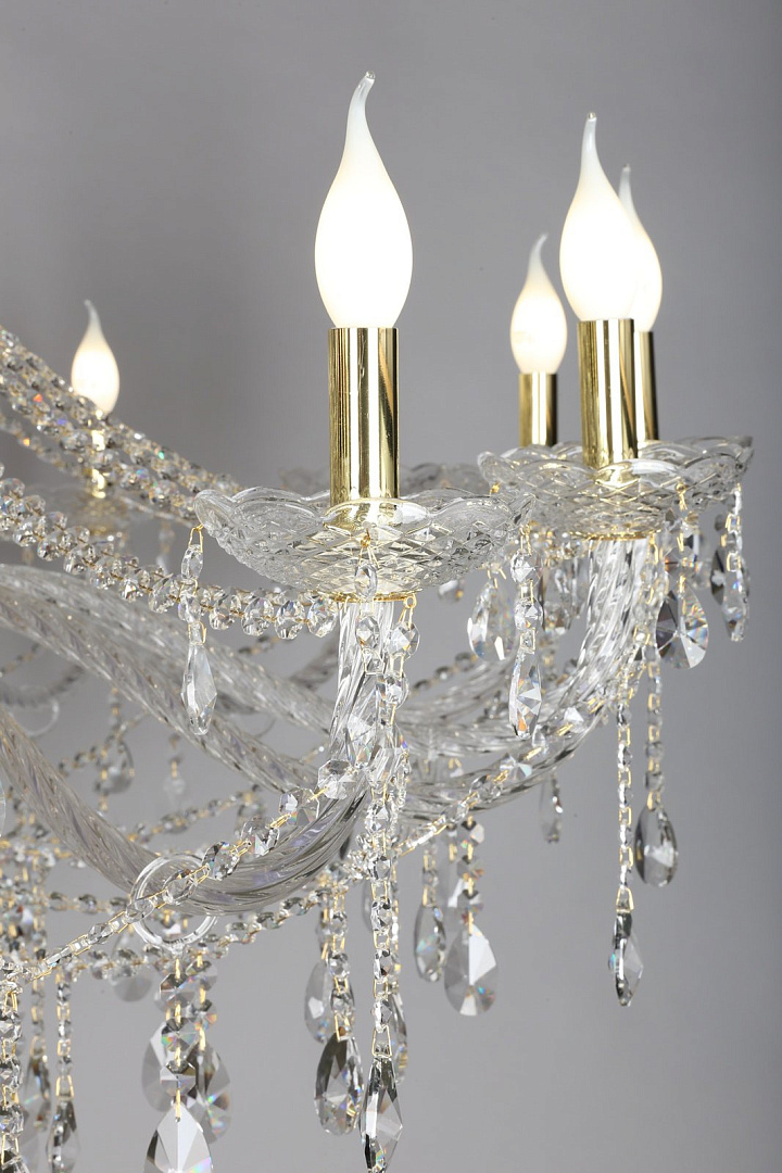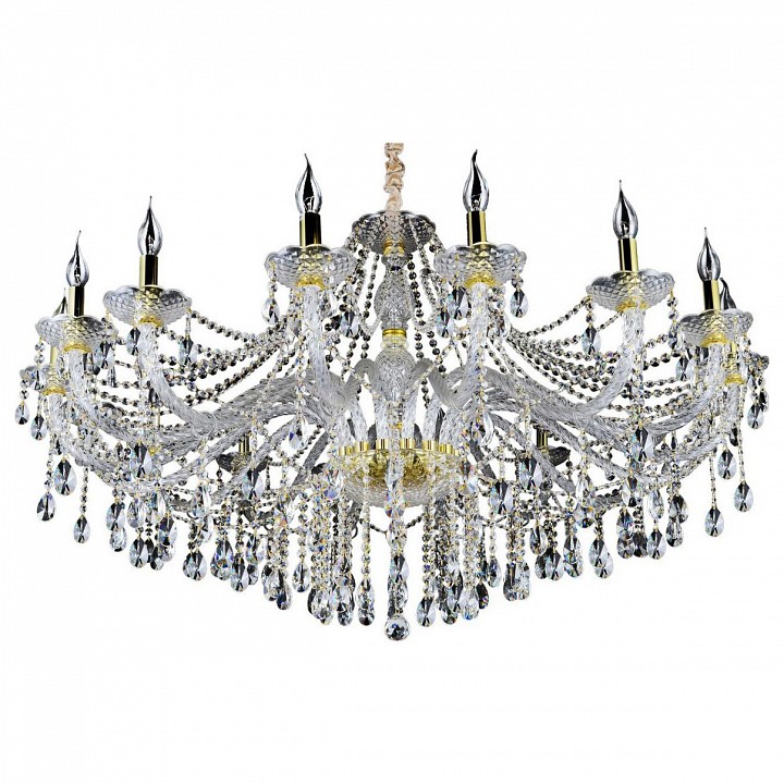 металла и стекла золотого и прозрачного цветов. Поверхность арматуры глянцевая. Плафон отсутствует. Декоративные элементы выполнены из прозрачного хрусталя. Осветительный прибор рассчитан на освещение пространства площадью 32 кв. м. Тип цоколя используемых ламп E14. Производитель рекомендует использовать лампы мощностью не более 40 Вт. Суммарная мощность светильника составляет 640 Вт. Лампочки в комплект не входят. Защита от попадания влаги и пыли внутрь изделия не предусмотрена. Рекомендуем к применению в гостиной, кабинете, спальне.