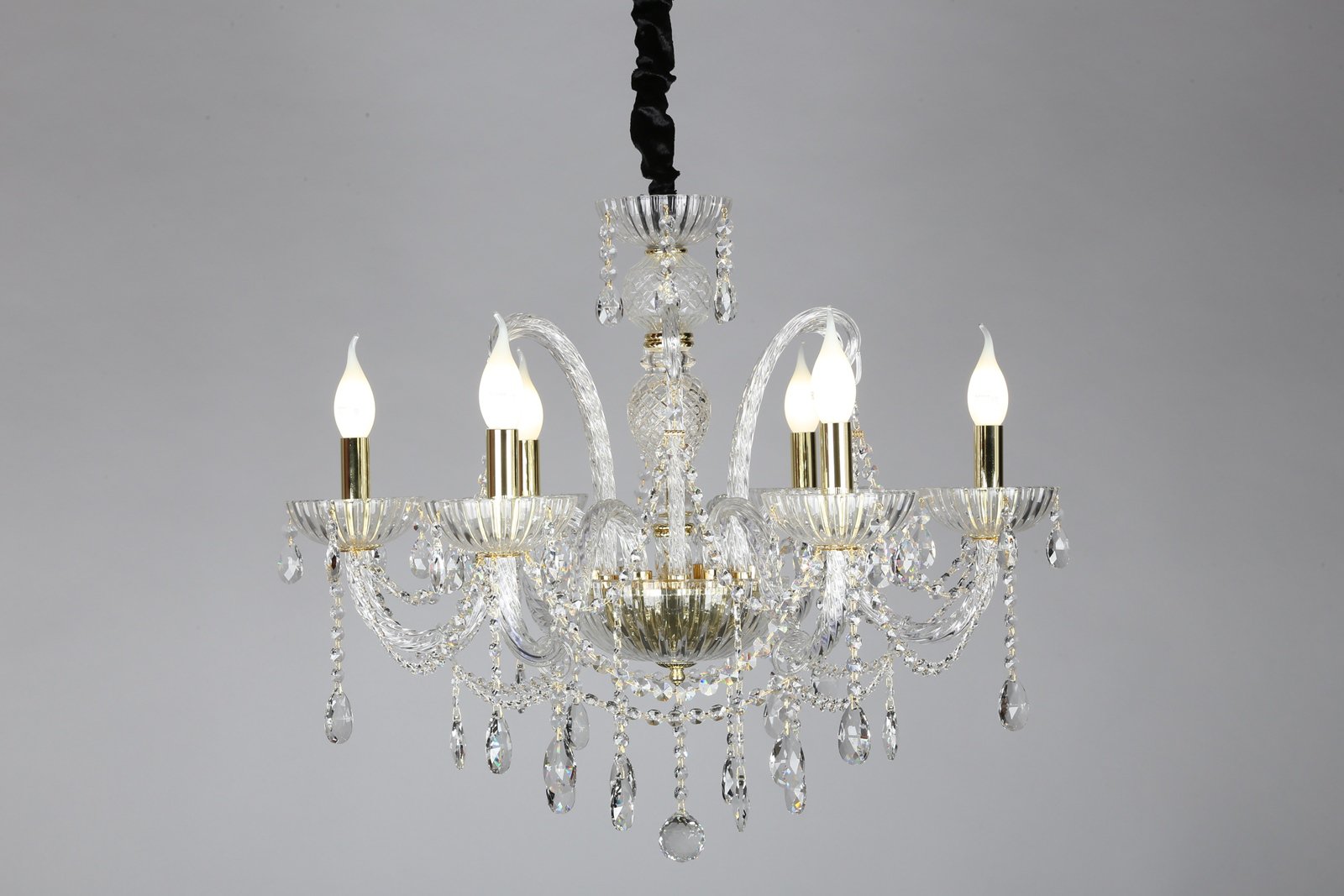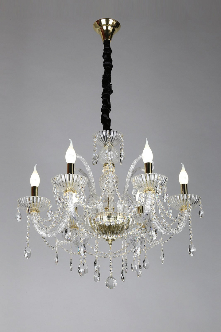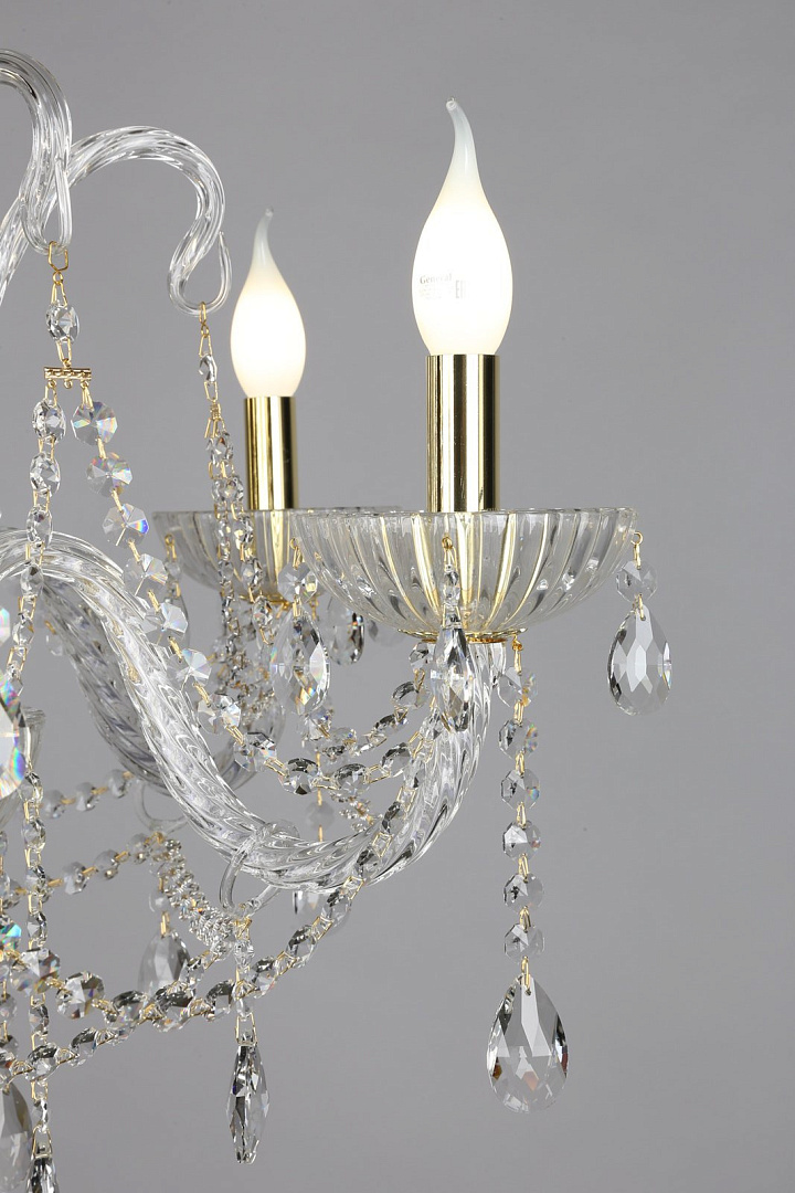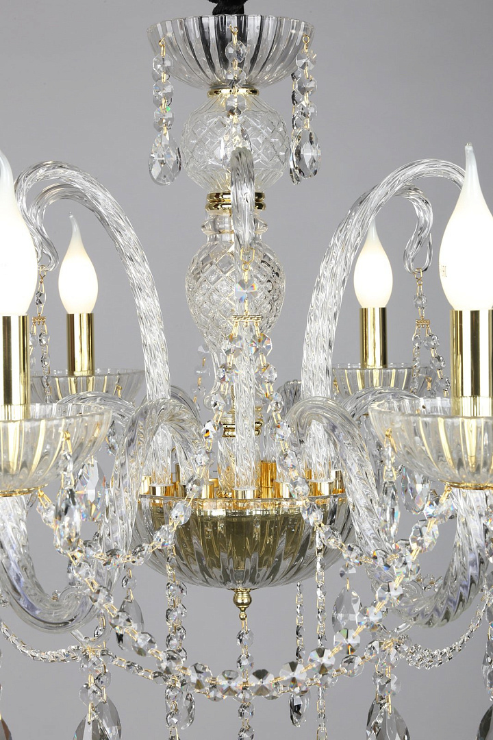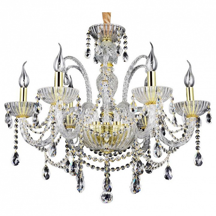 металла и стекла золотого и прозрачного цветов. Поверхность арматуры глянцевая. Плафон отсутствует. Декоративные элементы выполнены из прозрачного хрусталя. Осветительный прибор рассчитан на освещение пространства площадью 12 кв. м. Тип цоколя используемых ламп E14. Производитель рекомендует использовать лампы мощностью не более 40 Вт. Суммарная мощность светильника составляет 240 Вт. Лампочки в комплект не входят. Защита от попадания влаги и пыли внутрь изделия не предусмотрена. Рекомендуем к применению в гостиной, кабинете, спальне.