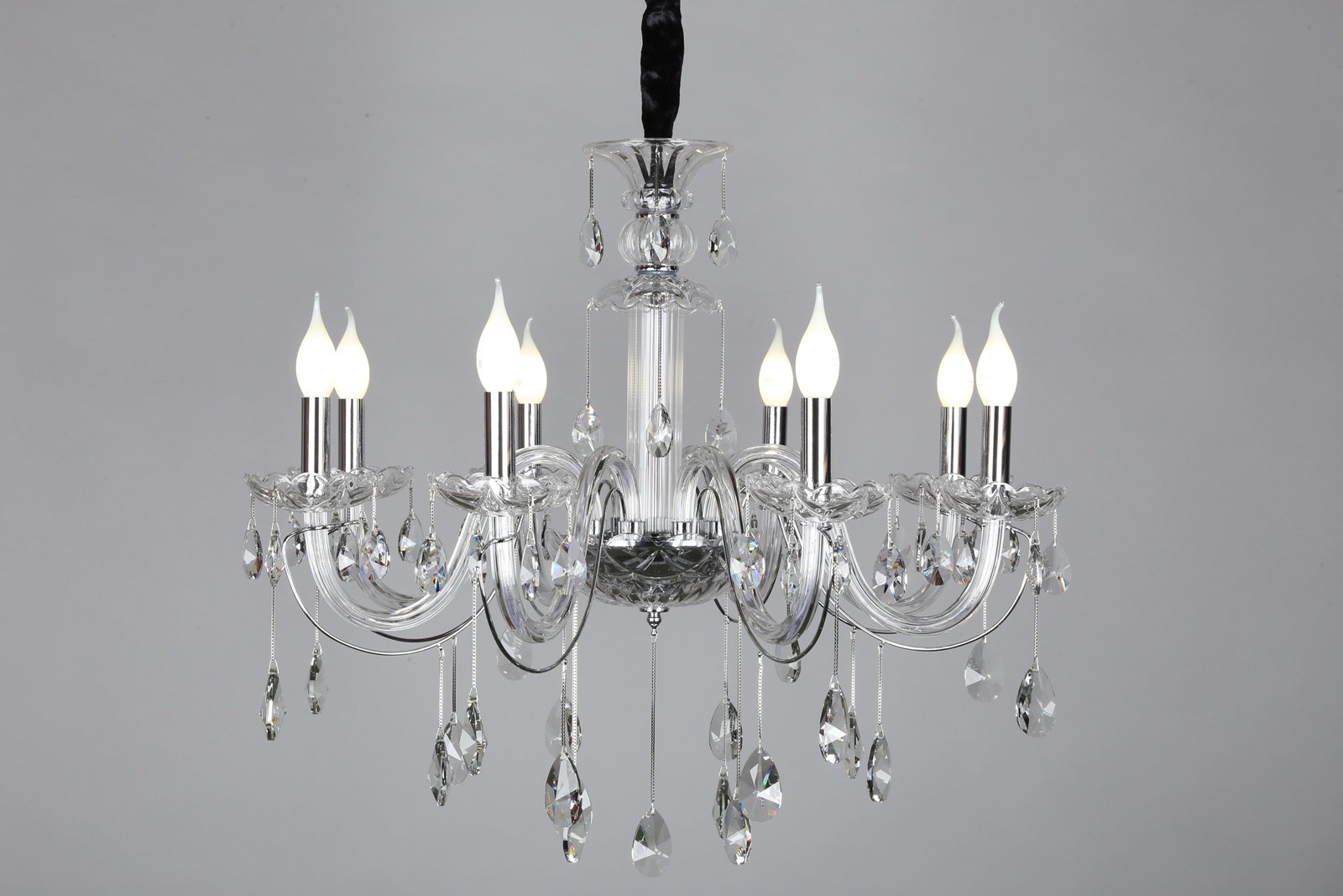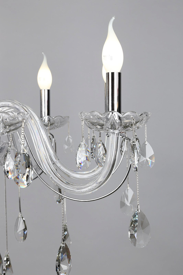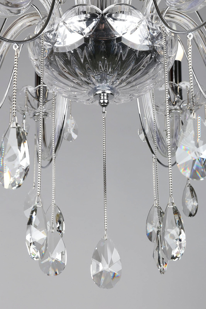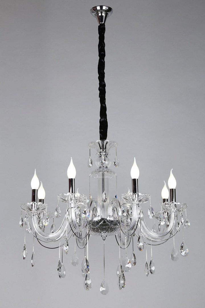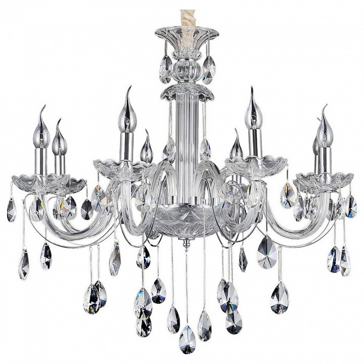 металла и стекла цветов хром и прозрачный. Поверхность арматуры глянцевая. Плафон отсутствует. Декоративные элементы выполнены из прозрачного хрусталя. Осветительный прибор рассчитан на освещение пространства площадью 16 кв. м. Тип цоколя используемых ламп E14. Производитель рекомендует использовать лампы мощностью не более 40 Вт. Суммарная мощность светильника составляет 320 Вт. Лампочки в комплект не входят. Защита от попадания влаги и пыли внутрь изделия не предусмотрена. Рекомендуем к применению в гостиной, кабинете, спальне.