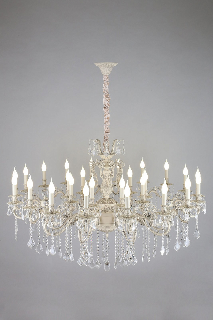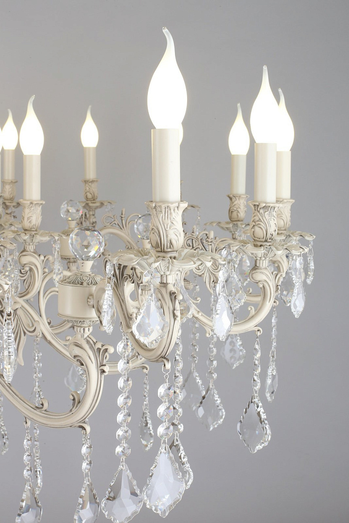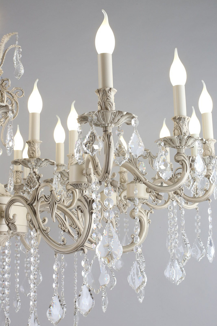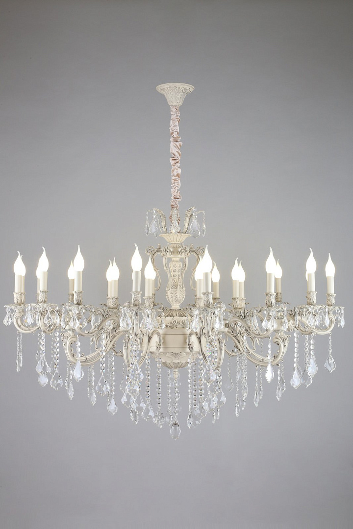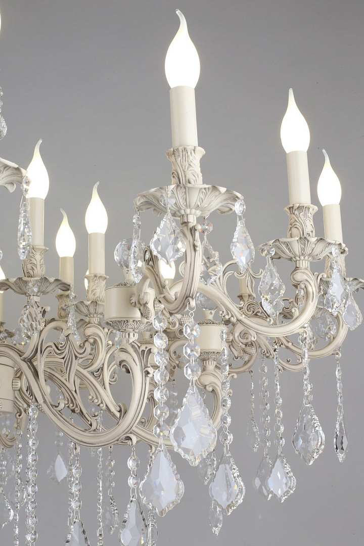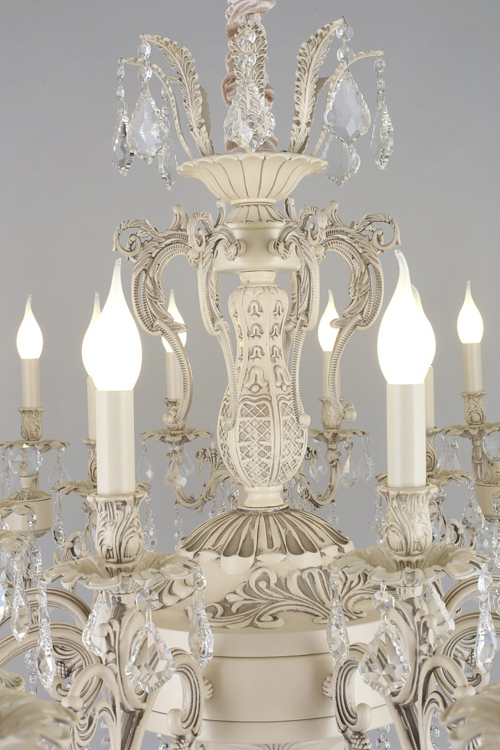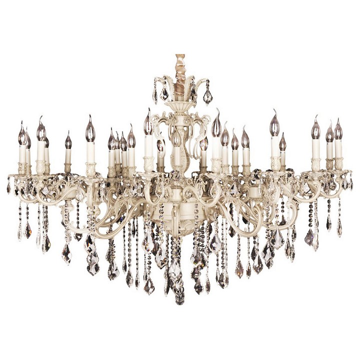 металла кремового цвета. Поверхность арматуры матовая, рельефная. Плафон отсутствует. Декоративные элементы выполнены из прозрачного хрусталя. Осветительный прибор рассчитан на освещение пространства площадью 81 кв. м. Тип цоколя используемых ламп E14. Производитель рекомендует использовать лампы мощностью не более 60 Вт. Суммарная мощность светильника составляет 1620 Вт. Лампочки в комплект не входят. Защита от попадания влаги и пыли внутрь изделия не предусмотрена. Рекомендуем к применению в гостиной, кабинете, спальне.