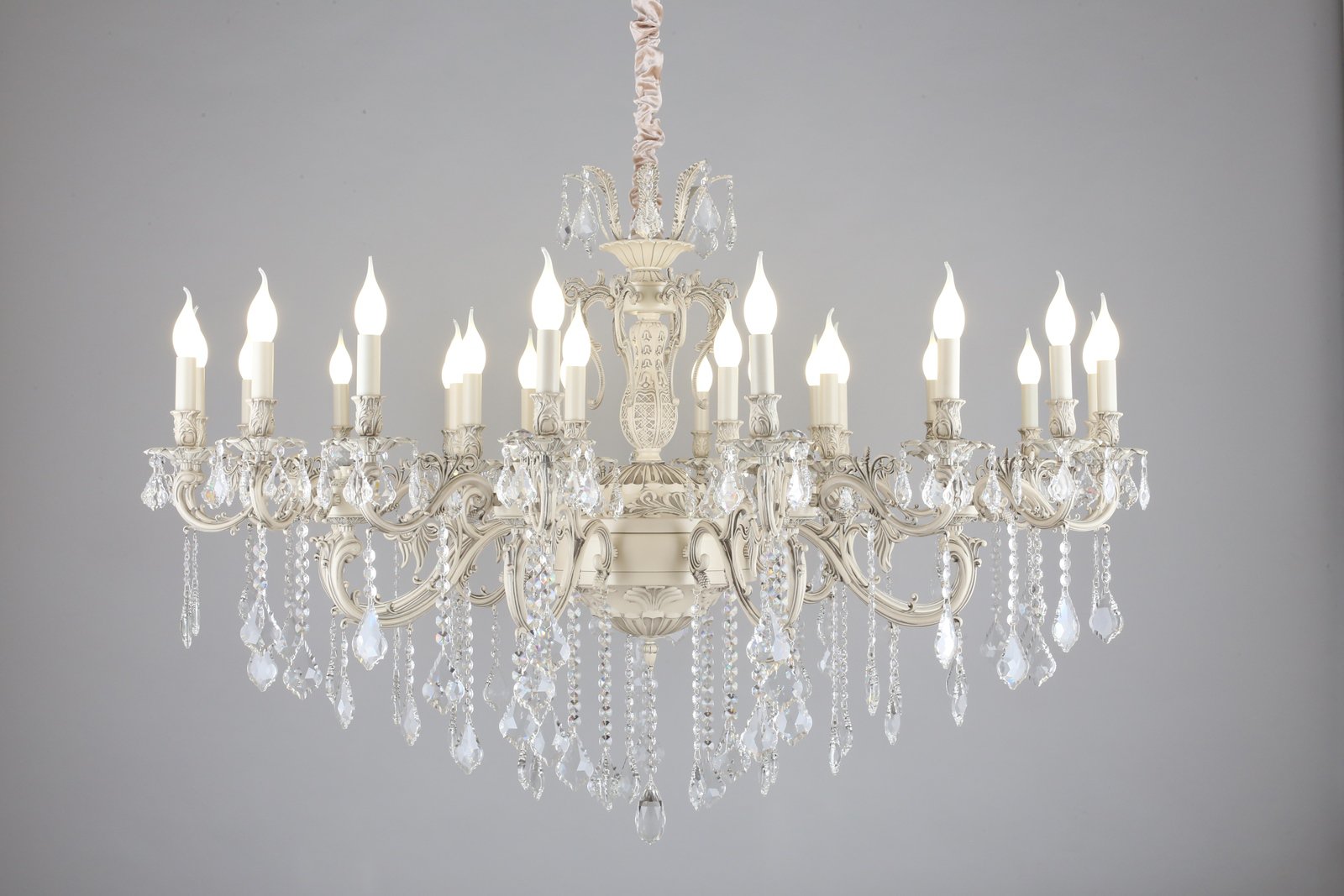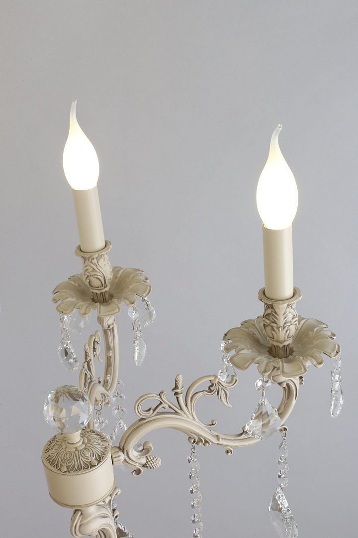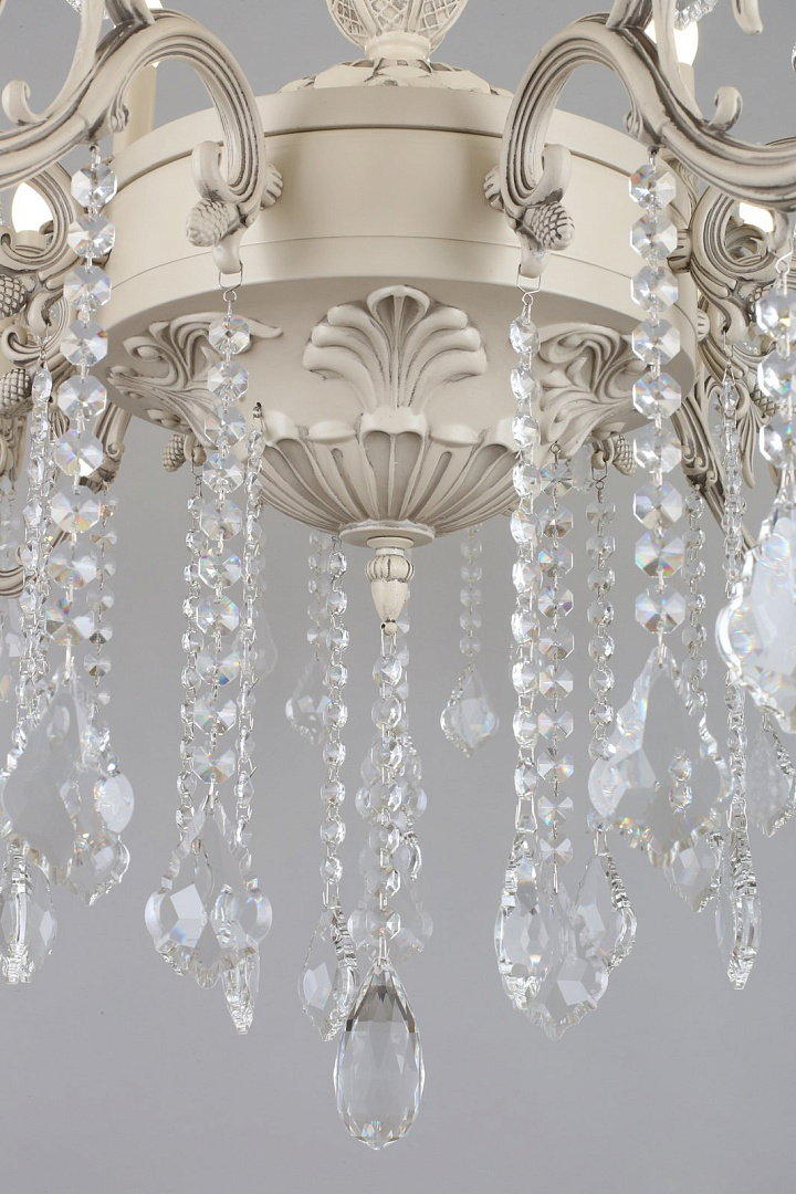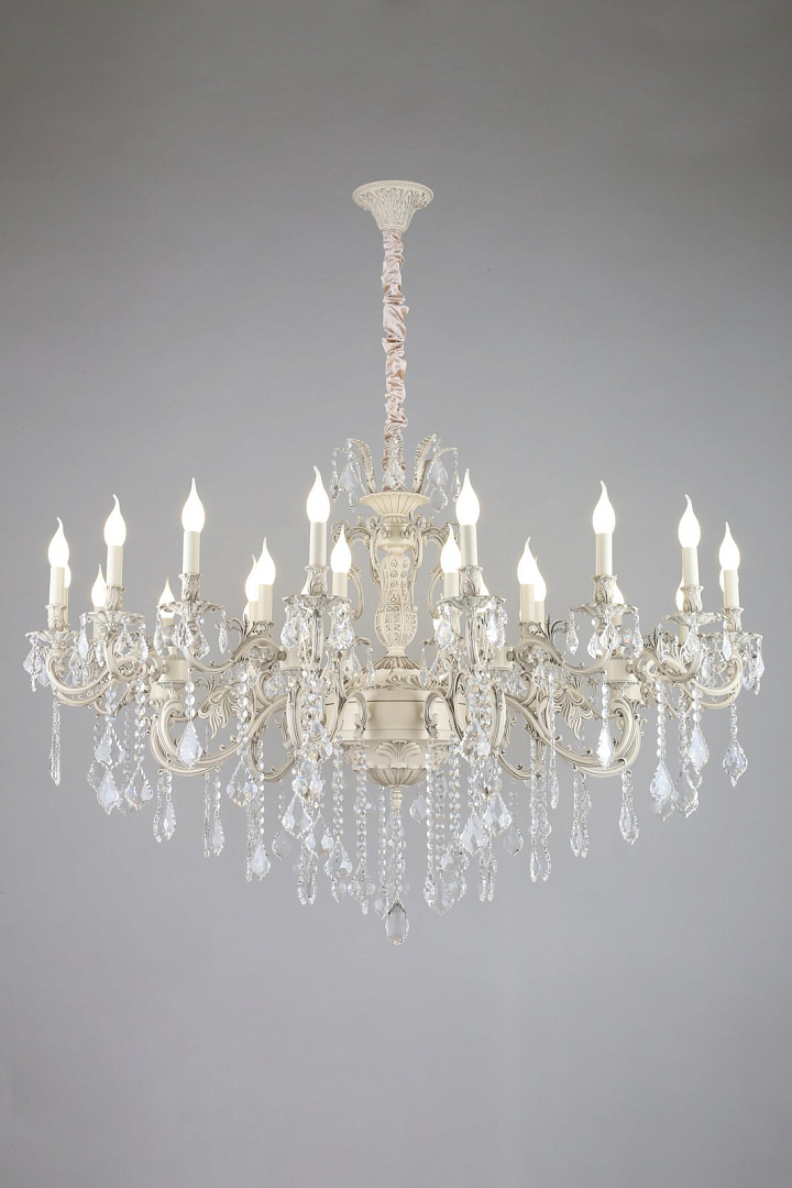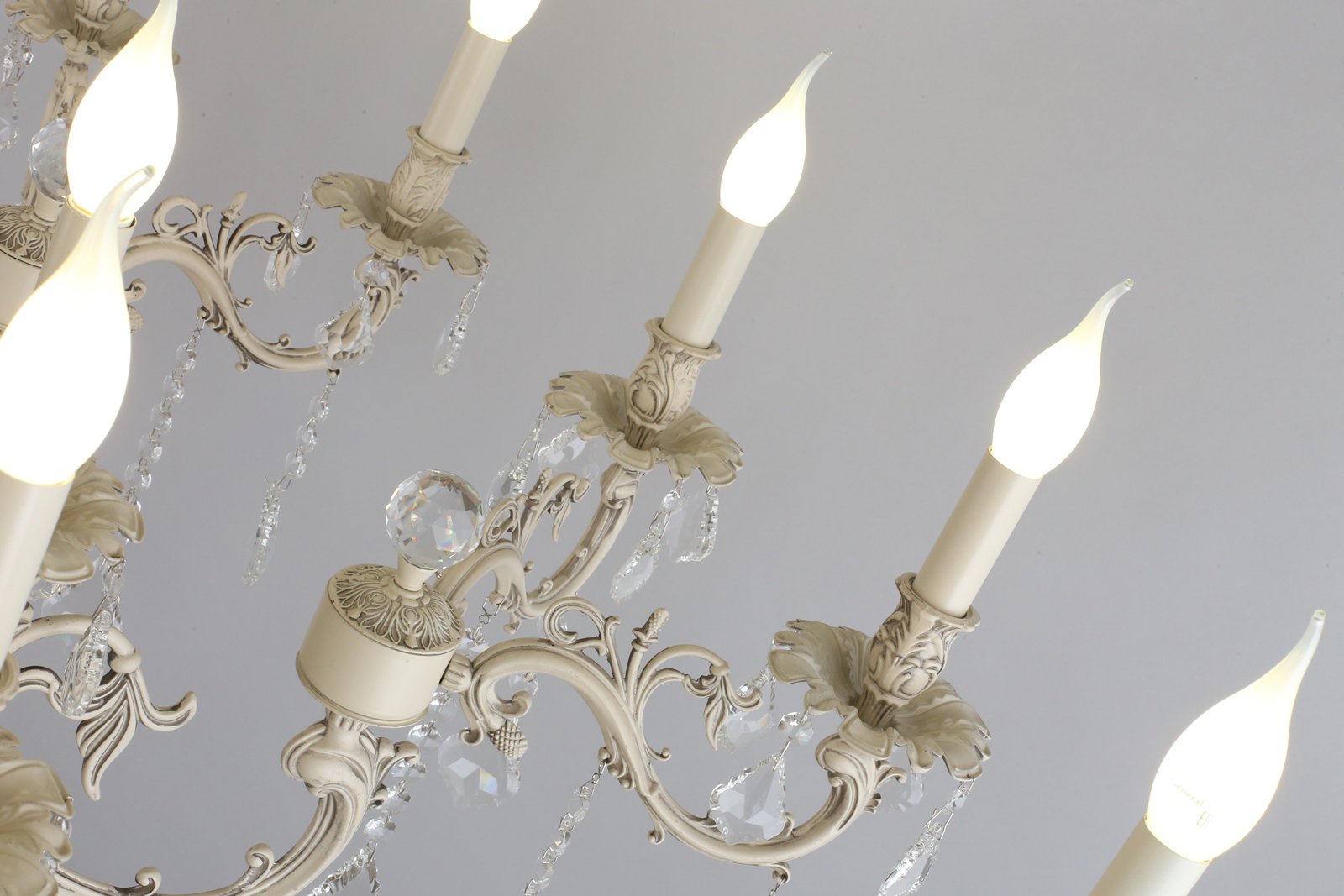 металла кремового цвета. Поверхность арматуры матовая, рельефная. Плафон отсутствует. Декоративные элементы выполнены из прозрачного хрусталя. Осветительный прибор рассчитан на освещение пространства площадью 81 кв. м. Тип цоколя используемых ламп E14. Производитель рекомендует использовать лампы мощностью не более 60 Вт. Суммарная мощность светильника составляет 1620 Вт. Лампочки в комплект не входят. Защита от попадания влаги и пыли внутрь изделия не предусмотрена. Рекомендуем к применению в гостиной, кабинете, спальне.