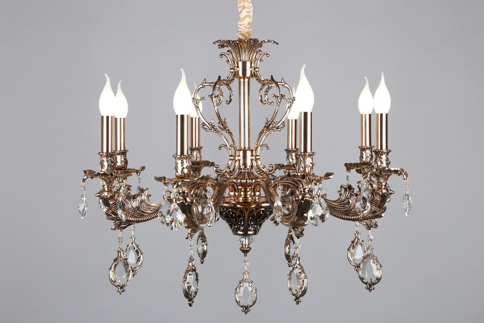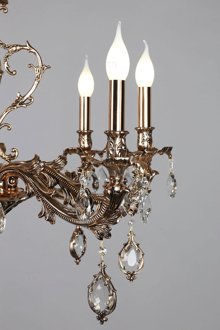 металла золотого цвета. Поверхность арматуры глянцевая и рельефная. Плафон отсутствует. Декоративные элементы выполнены из прозрачного хрусталя. Осветительный прибор рассчитан на освещение пространства площадью 16 кв. м. Тип цоколя используемых ламп E14. Производитель рекомендует использовать лампы мощностью не более 40 Вт. Суммарная мощность светильника составляет 320 Вт. Лампочки в комплект не входят. Защита от попадания влаги и пыли внутрь изделия не предусмотрена. Рекомендуем к применению в гостиной, кабинете, спальне.
