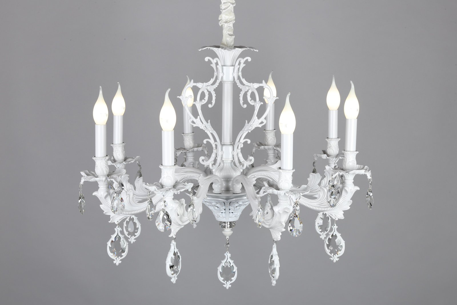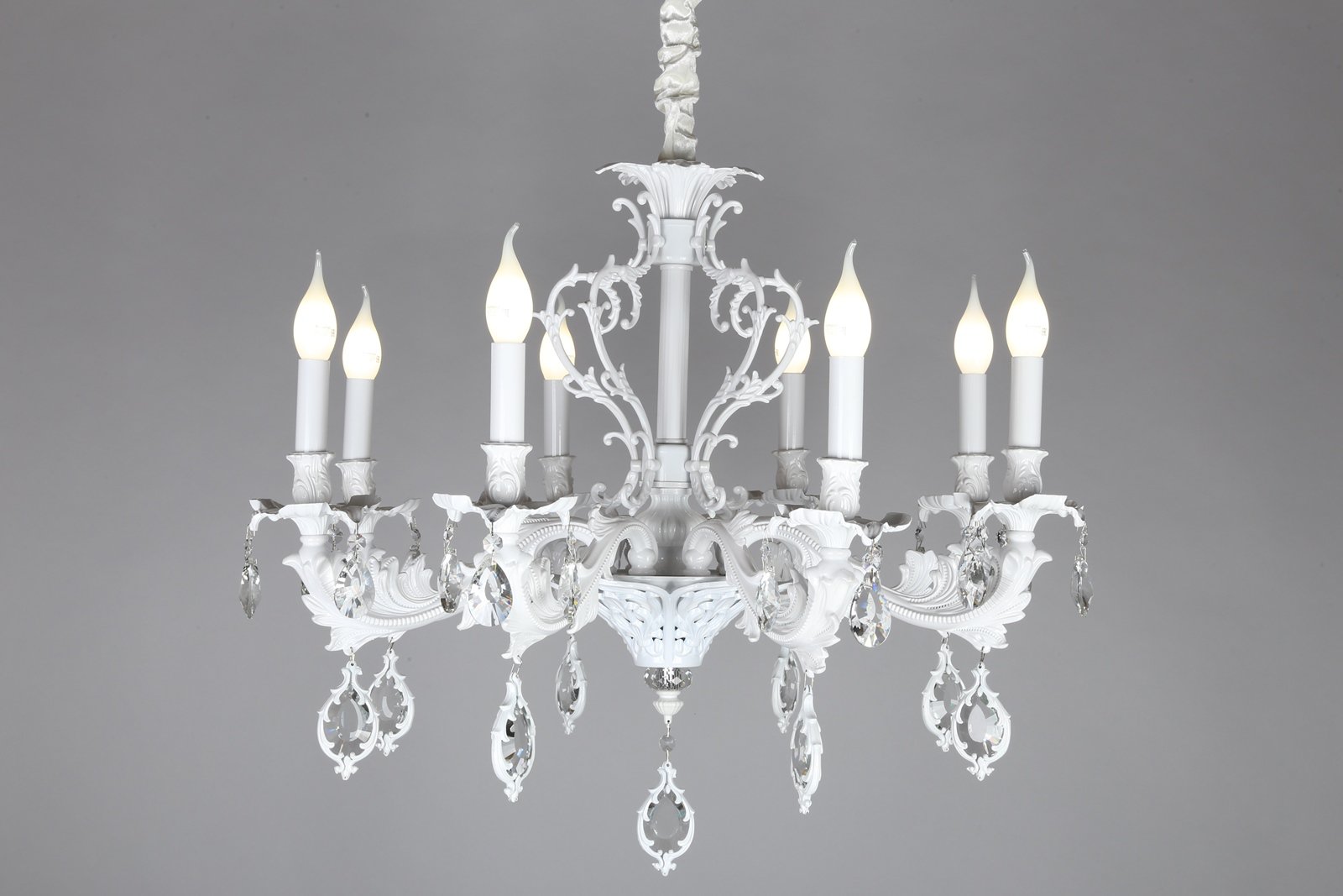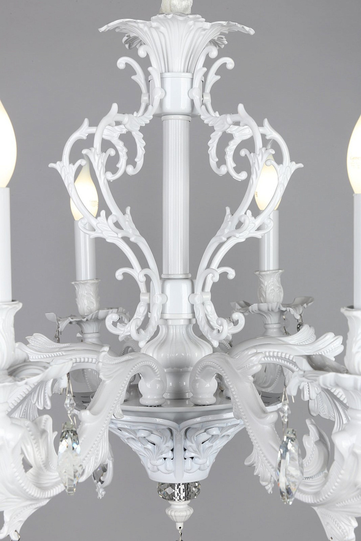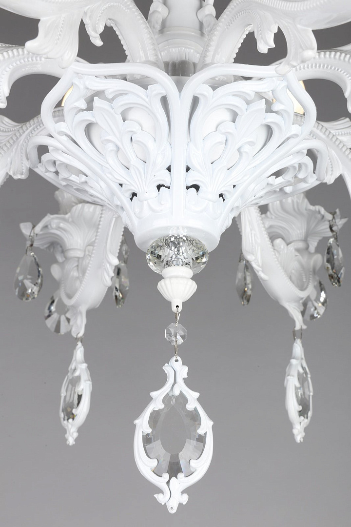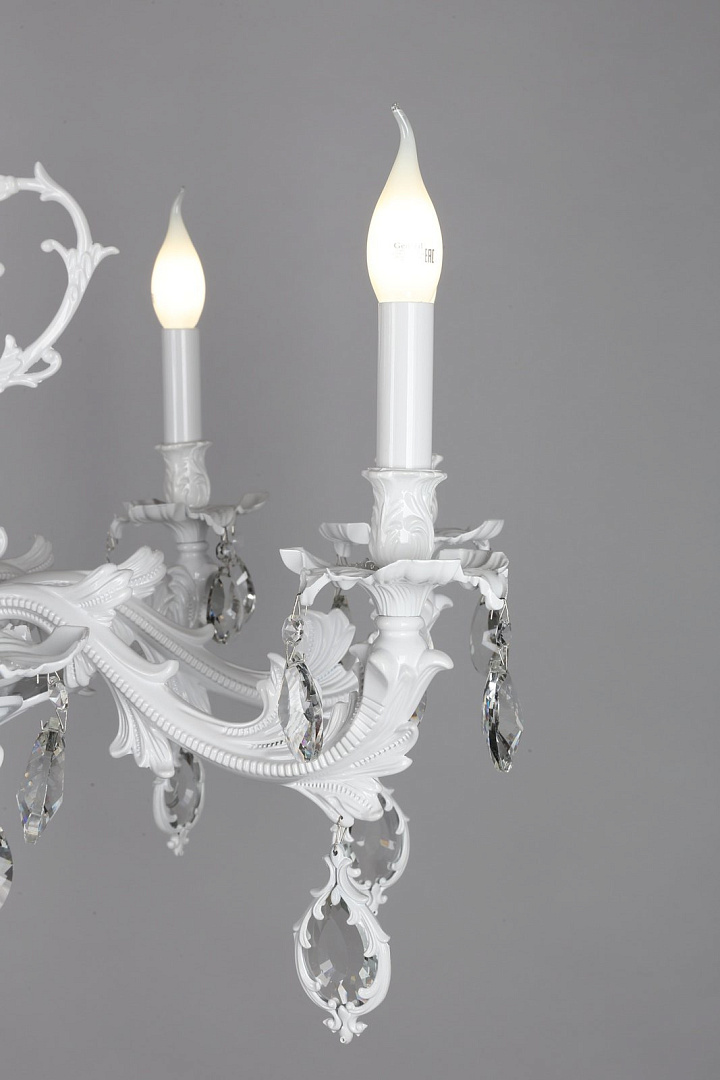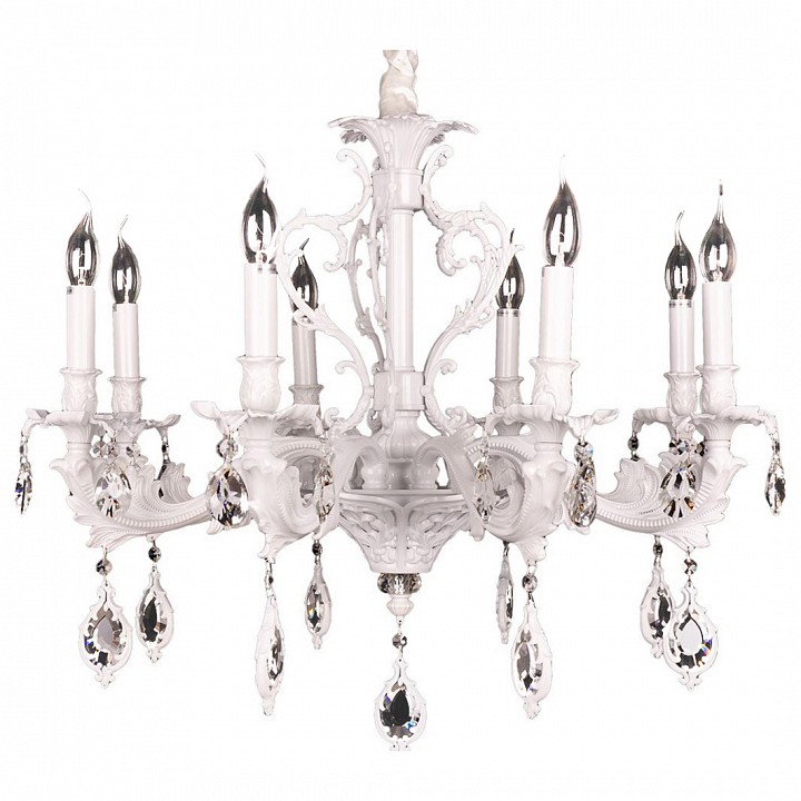 металла белого цвета. Поверхность арматуры матовая, рельефная. Плафон отсутствует. Декоративные элементы выполнены из прозрачного хрусталя. Осветительный прибор рассчитан на освещение пространства площадью 16 кв. м. Тип цоколя используемых ламп E14. Производитель рекомендует использовать лампы мощностью не более 40 Вт. Суммарная мощность светильника составляет 320 Вт. Лампочки в комплект не входят. Защита от попадания влаги и пыли внутрь изделия не предусмотрена. Рекомендуем к применению в гостиной, кабинете, спальне.