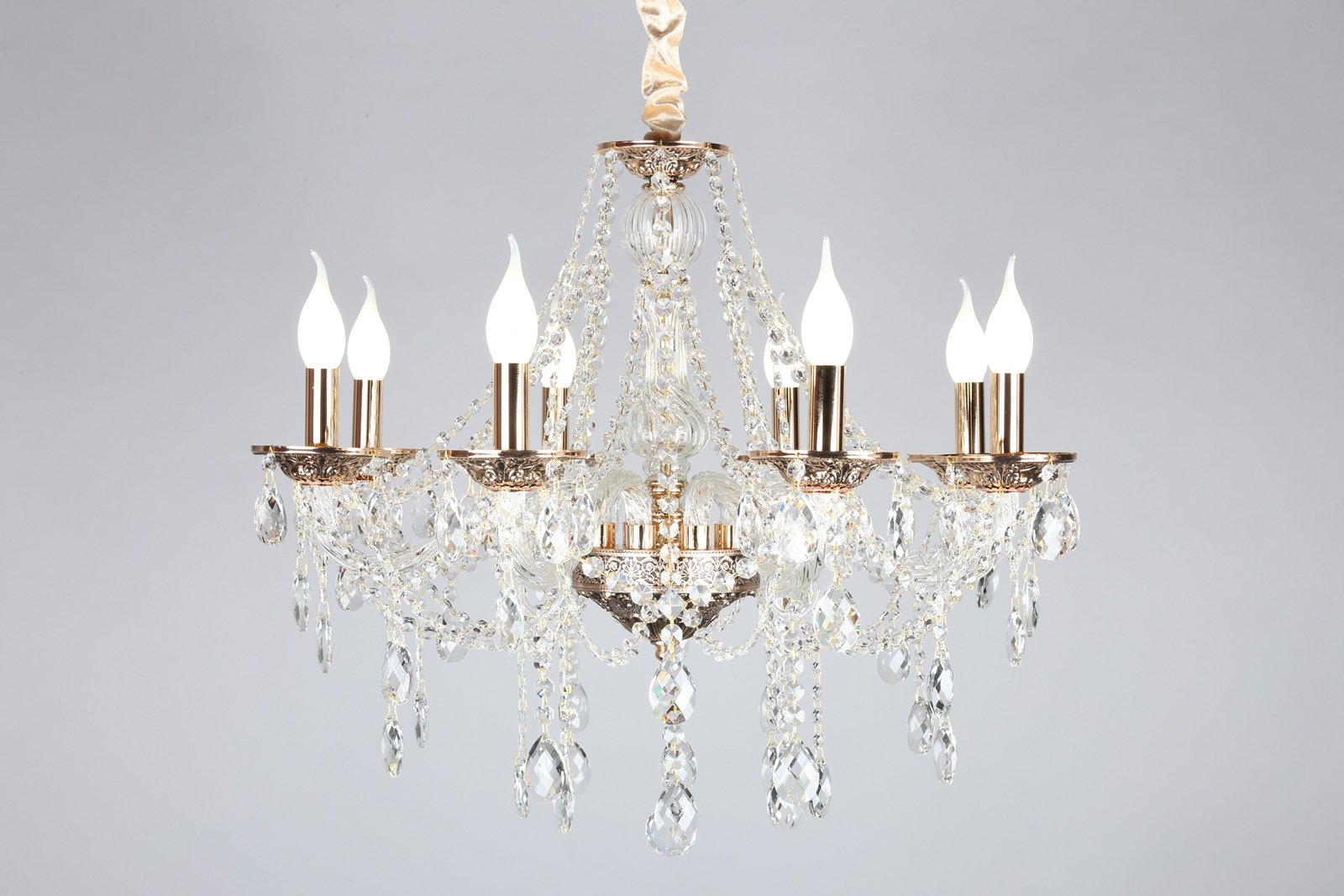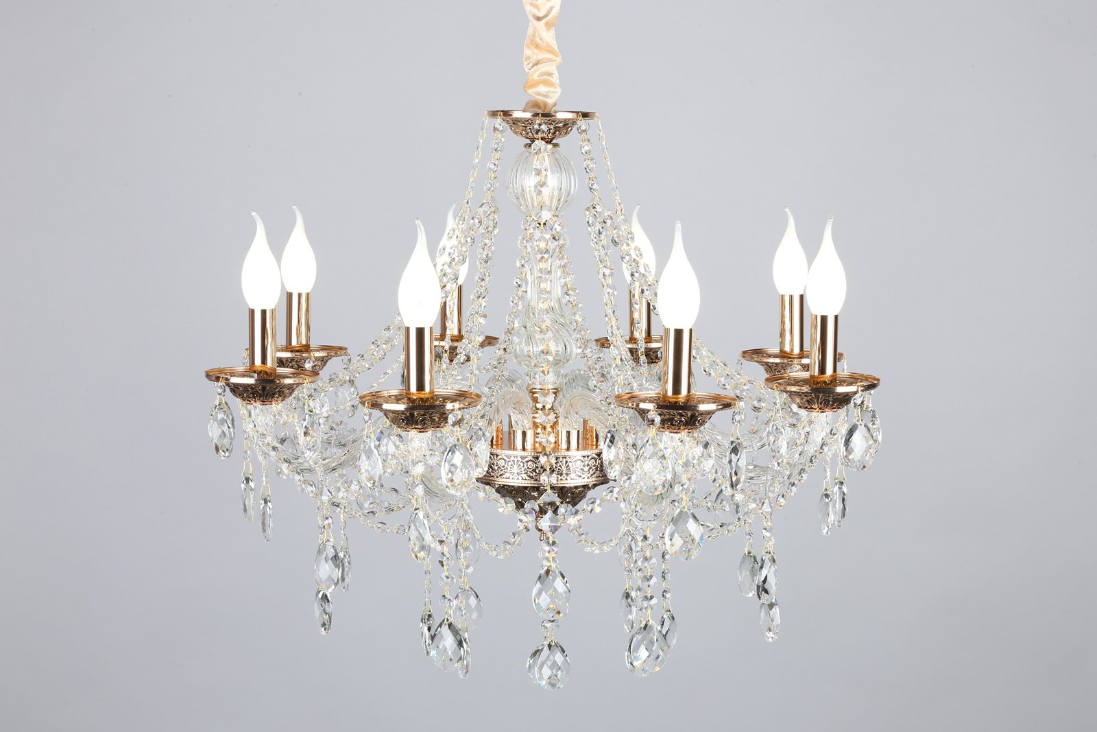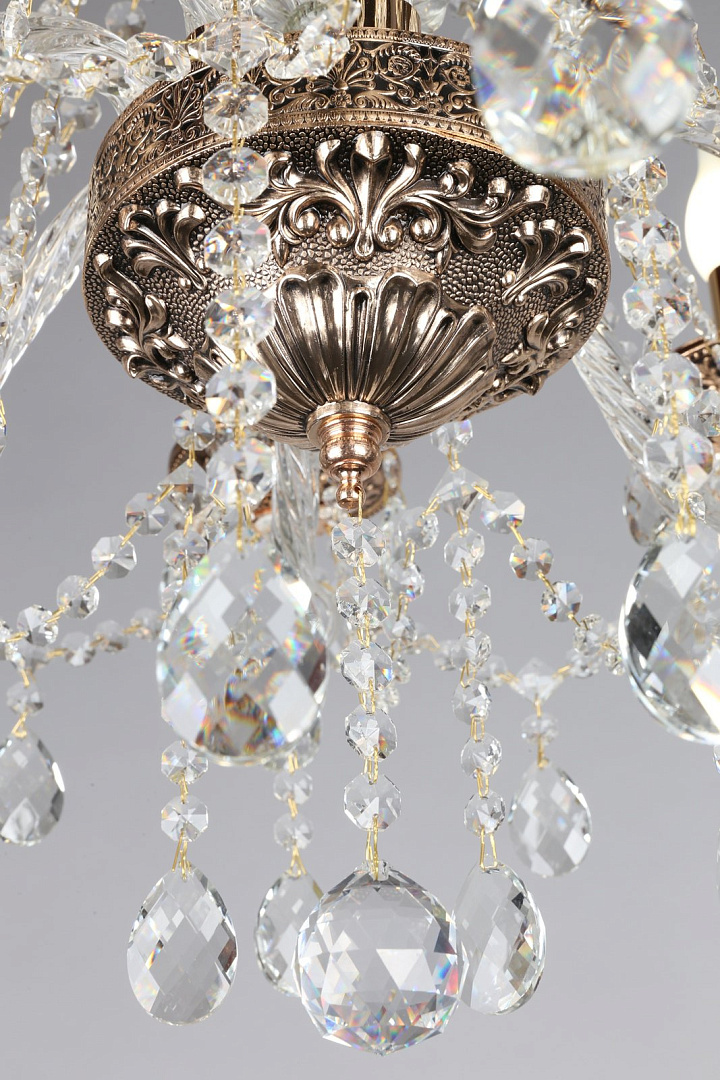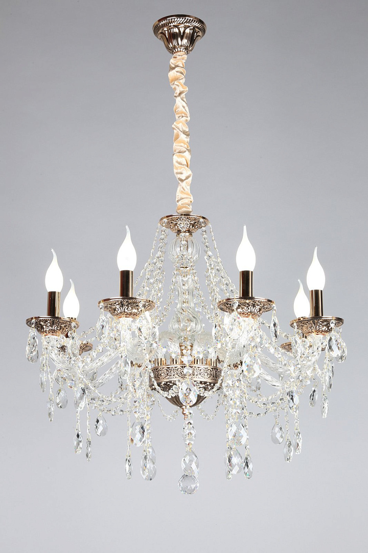 металла и стекла золотого цвета. Поверхность арматуры глянцевая. Плафон отсутствует. Декоративные элементы выполнены из прозрачного хрусталя. Осветительный прибор рассчитан на освещение пространства площадью 16 кв. м. Тип цоколя используемых ламп E14. Производитель рекомендует использовать лампы мощностью не более 40 Вт. Суммарная мощность светильника составляет 320 Вт. Лампочки в комплект не входят. Защита от попадания влаги и пыли внутрь изделия не предусмотрена. Рекомендуем к применению в гостиной, кабинете, спальне.