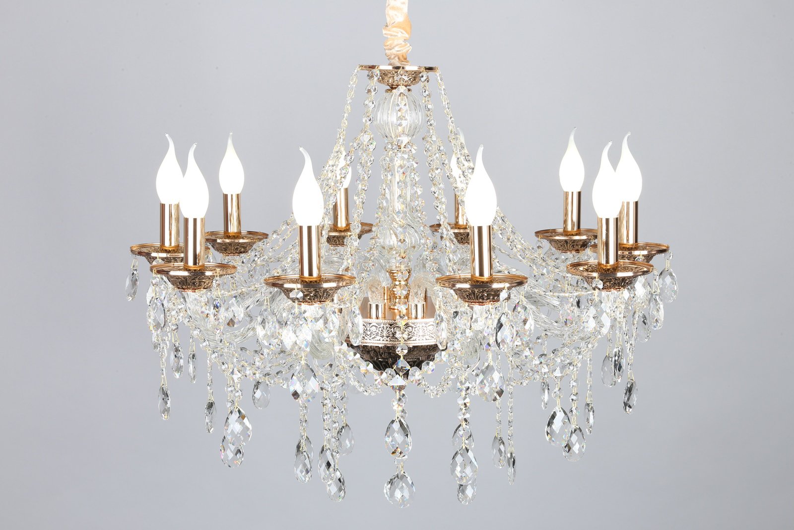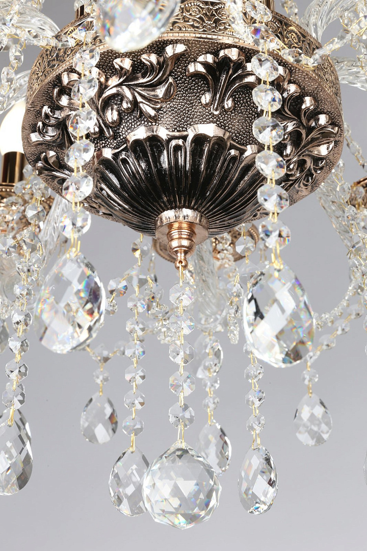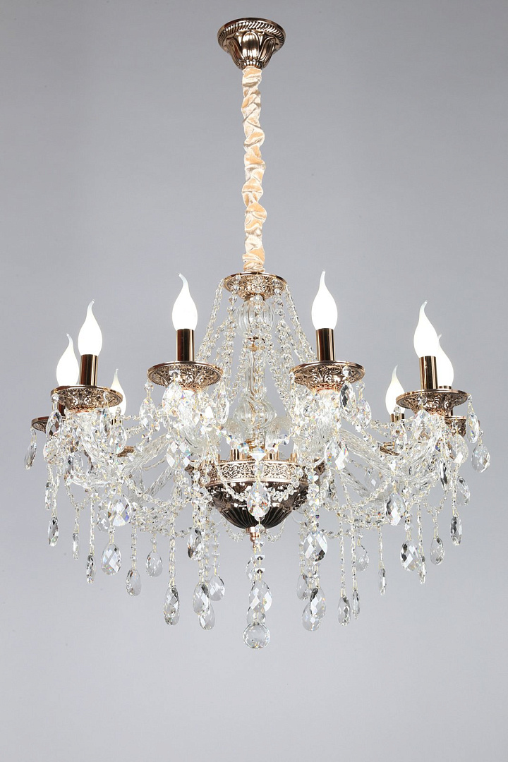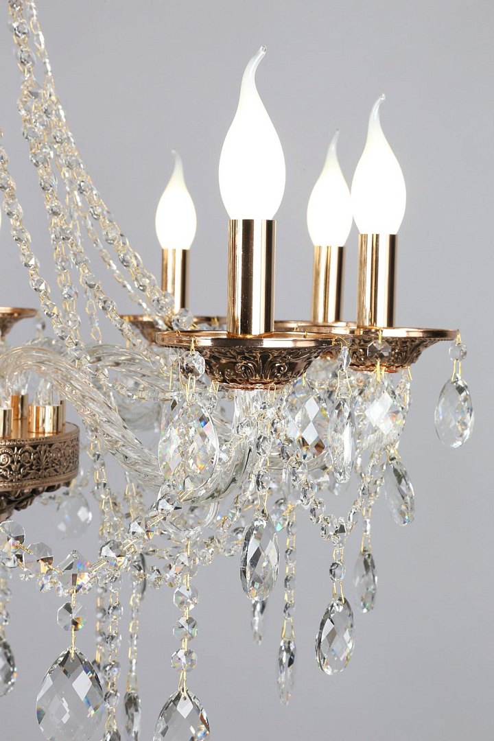 металла и стекла золотого цвета. Поверхность арматуры глянцевая. Плафон отсутствует. Декоративные элементы выполнены из прозрачного хрусталя. Осветительный прибор рассчитан на освещение пространства площадью 20 кв. м. Тип цоколя используемых ламп E14. Производитель рекомендует использовать лампы мощностью не более 40 Вт. Суммарная мощность светильника составляет 400 Вт. Лампочки в комплект не входят. Защита от попадания влаги и пыли внутрь изделия не предусмотрена. Рекомендуем к применению в гостиной, кабинете, спальне.
