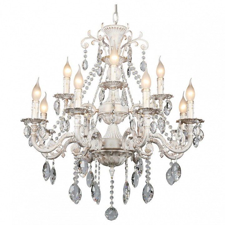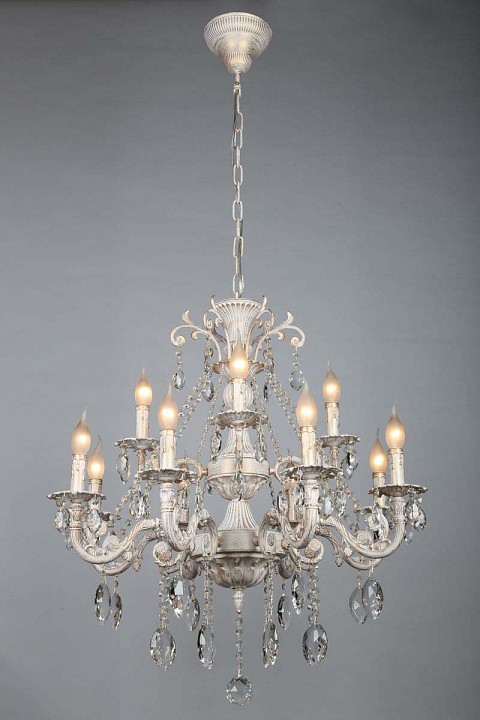 металла белого цвета с золотым рисунком. Поверхность арматуры матовая, рельефная. Плафон отсутствует. Декоративные элементы выполнены из прозрачного хрусталя. Осветительный прибор рассчитан на освещение пространства площадью 24 кв. м. Тип цоколя используемых ламп E14. Производитель рекомендует использовать лампы мощностью не более 40 Вт. Суммарная мощность светильника составляет 480 Вт. Лампочки в комплект не входят. Защита от попадания влаги и пыли внутрь изделия не предусмотрена. Рекомендуем к применению в гостиной, кабинете, спальне.