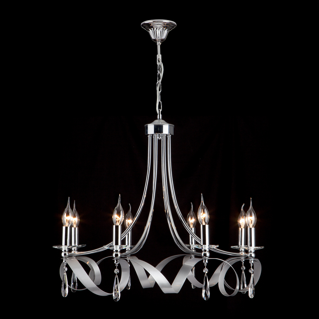 металла цвета хром. Поверхность арматуры глянцевая. Плафон отсутствует. Декоративные элементы выполнены из прозрачного хрусталя. Осветительный прибор рассчитан на освещение пространства площадью 38 кв. м. Тип цоколя используемых ламп E14. Производитель рекомендует использовать лампы мощностью не более 60 Вт. Суммарная мощность светильника составляет 480 Вт. Лампочки в комплект не входят. Защита от попадания влаги и пыли внутрь изделия не предусмотрена. Рекомендуем к применению в гостиной, кабинете, спальне.