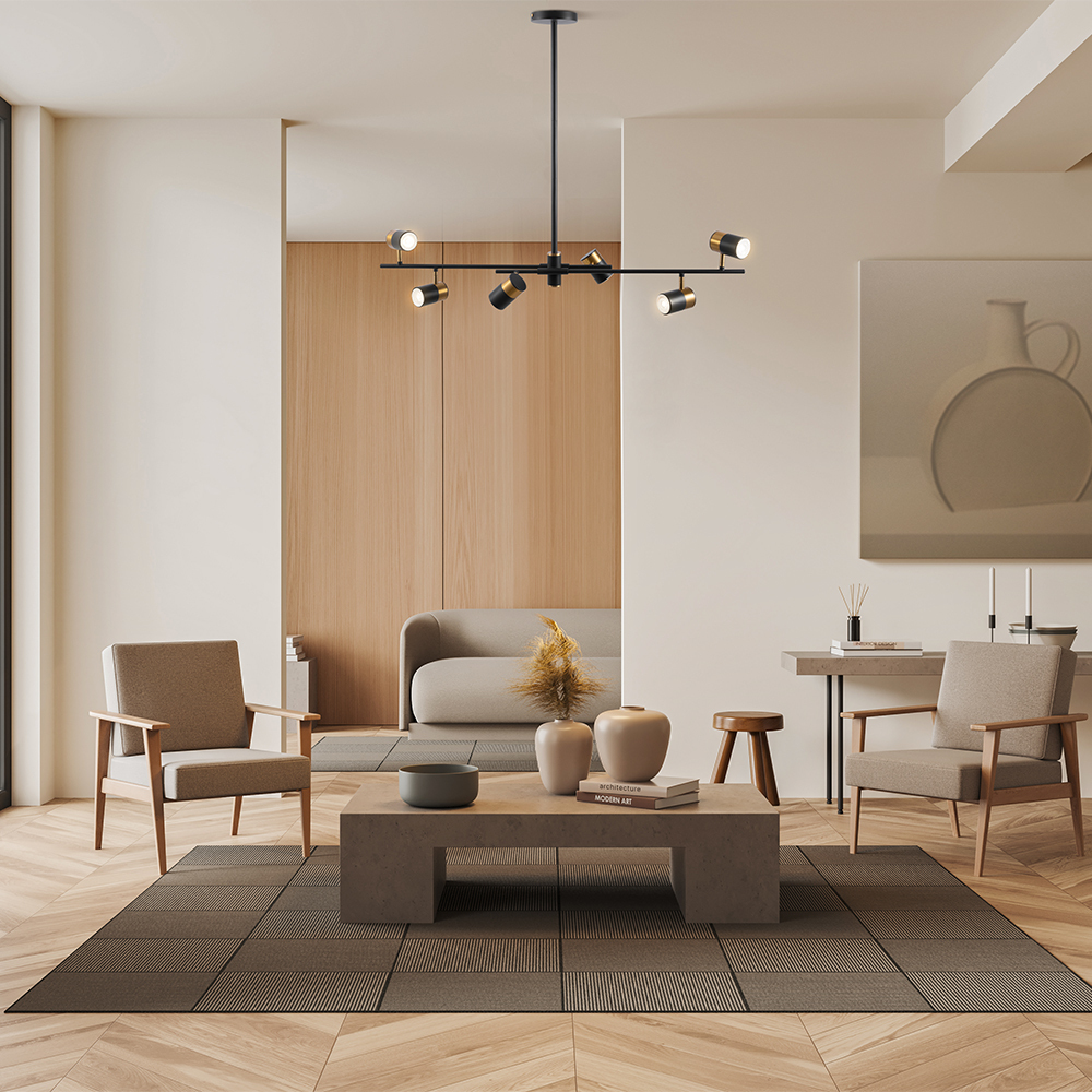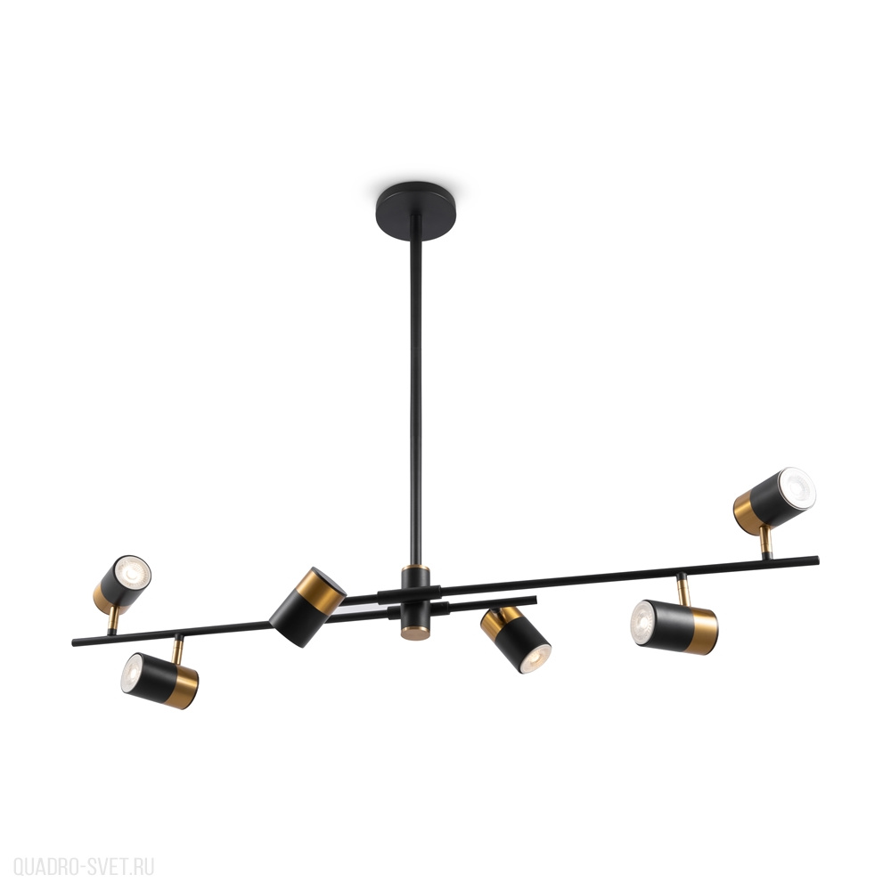 Арматура и плафоны из металла. Черный цвет дополнен латунной окантовкой. Поворотные плафоны и арматура позволяют видоизменять композицию и регулировать направление светового потока. Источник света – лампа GU10.