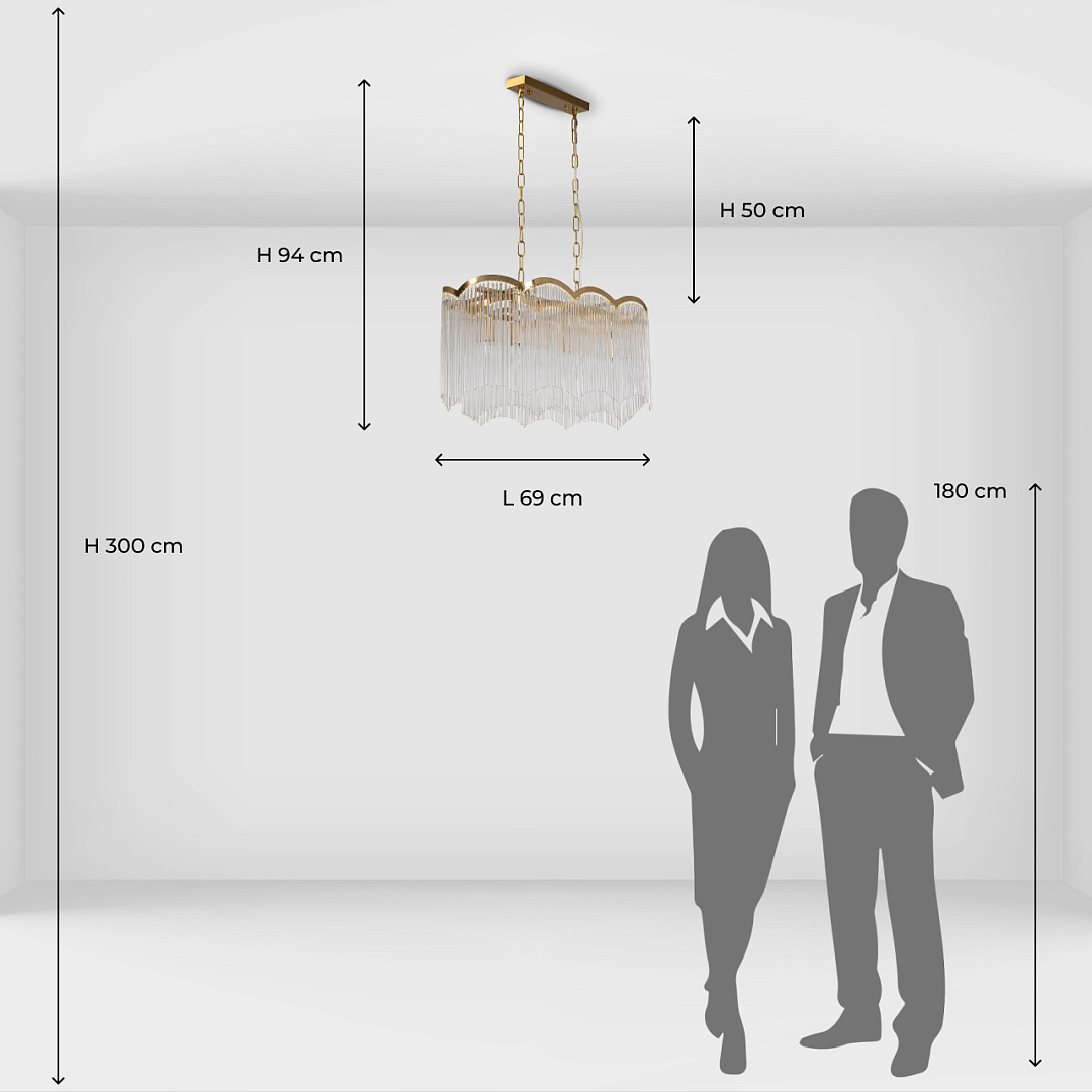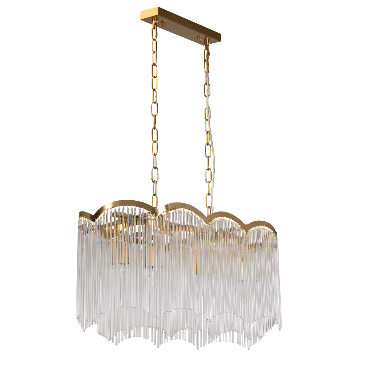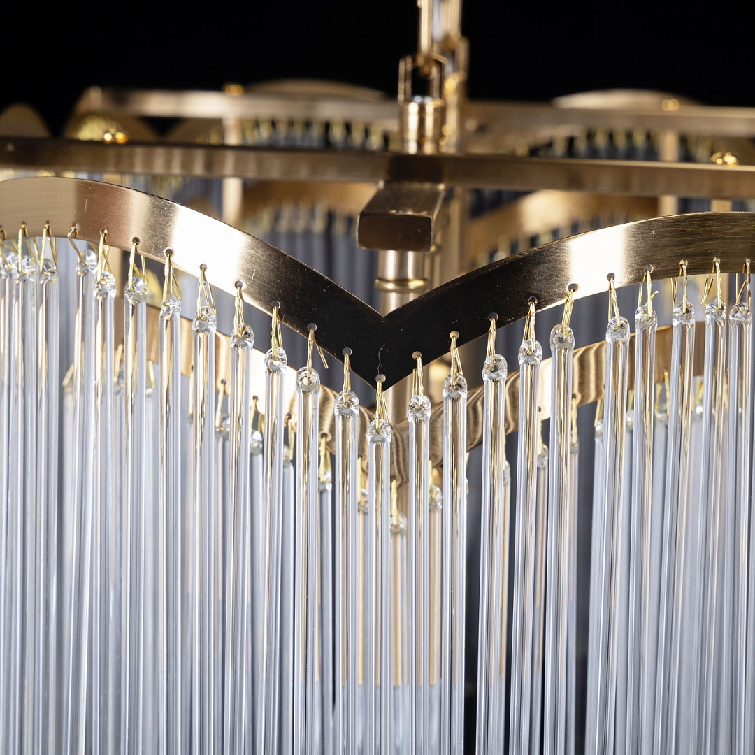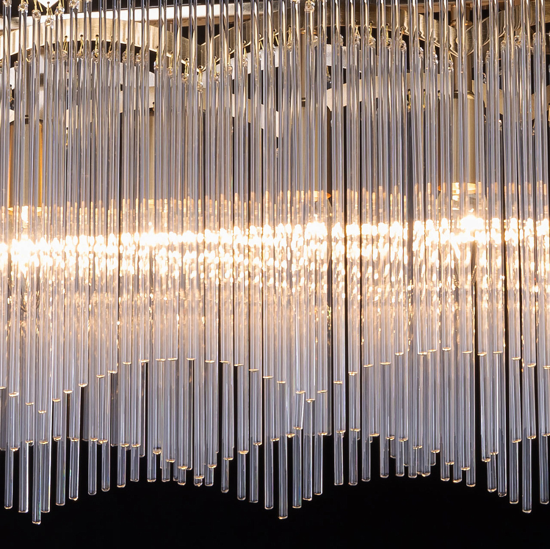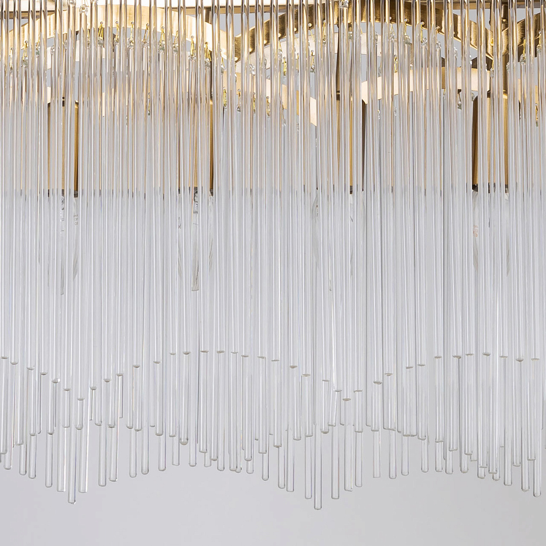 Подвесная люстра представляет собой потрясающий каскад стеклянных трубочек, напоминающих струи воды или льдинки. Воздушный облик люстры подчеркивает металлическое основание насыщенного латунного цвета. Необычный образ подвесной люстры завершается волнистой формой основания в стиле модерн.Возможность регулировать комфортную высоту.Заменяемые источники света удобны в эксплуатации.