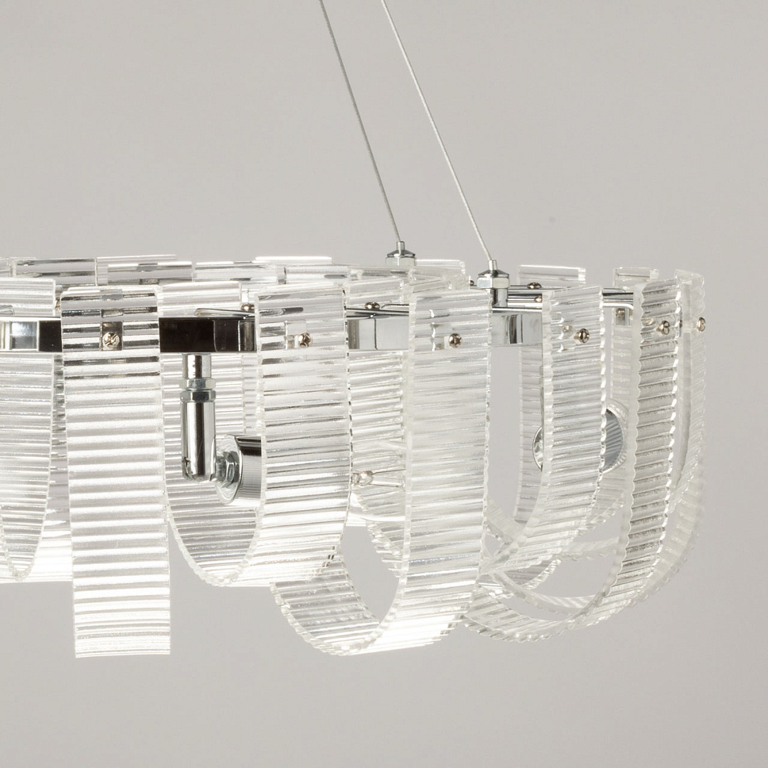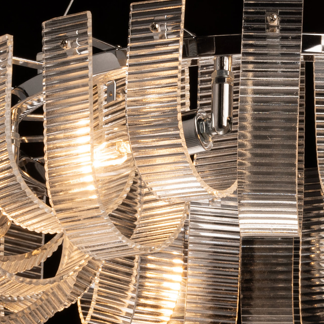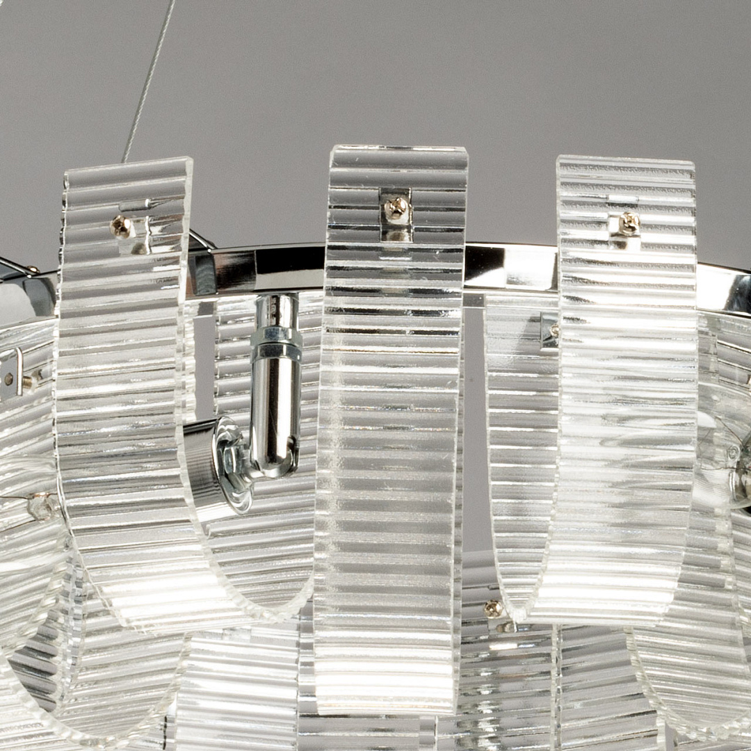 Подвесная люстра привлекает внимание необычным дизайном, добавляя индивидуальности интерьеру. Современный цвет хрома гармонично дополняется дизайном в стиле лофт. Фактура прозрачного вулканического стекла с растительным декором  разбивает световой поток на множество ярких бликов, которые создают в комнате романтичную атмосферу. Возможность регулировать комфортную высоту. Заменяемые источники света удобны в эксплуатации.