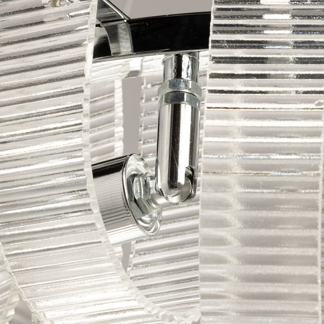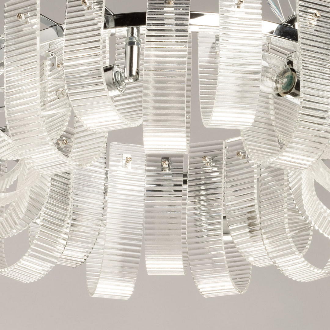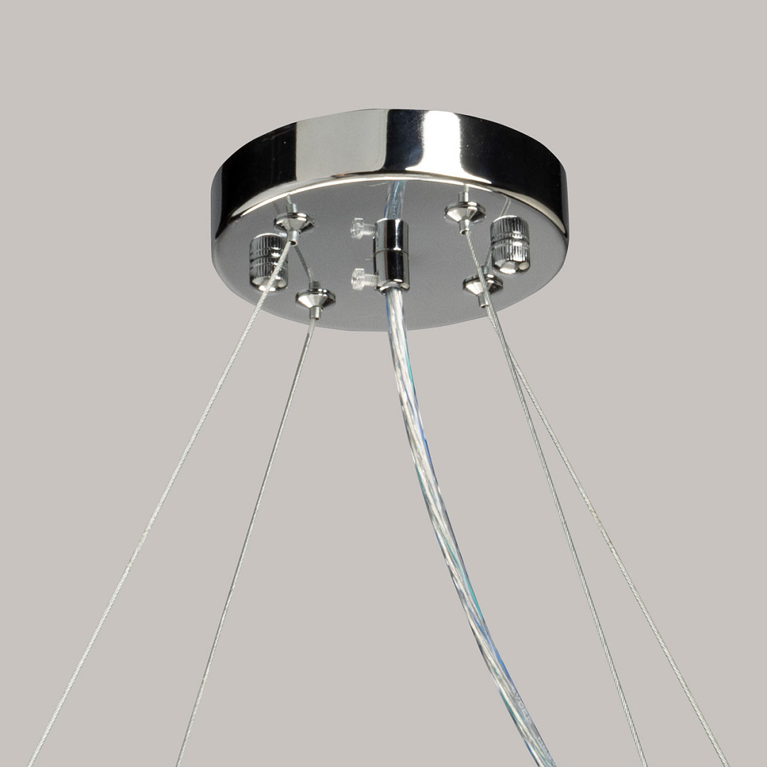 Подвесная люстра привлекает внимание необычным дизайном, добавляя индивидуальности интерьеру. Современный цвет хрома гармонично дополняется дизайном в стиле лофт. Фактура прозрачного вулканического стекла с растительным декором  разбивает световой поток на множество ярких бликов, которые создают в комнате романтичную атмосферу. Возможность регулировать комфортную высоту. Заменяемые источники света удобны в эксплуатации.