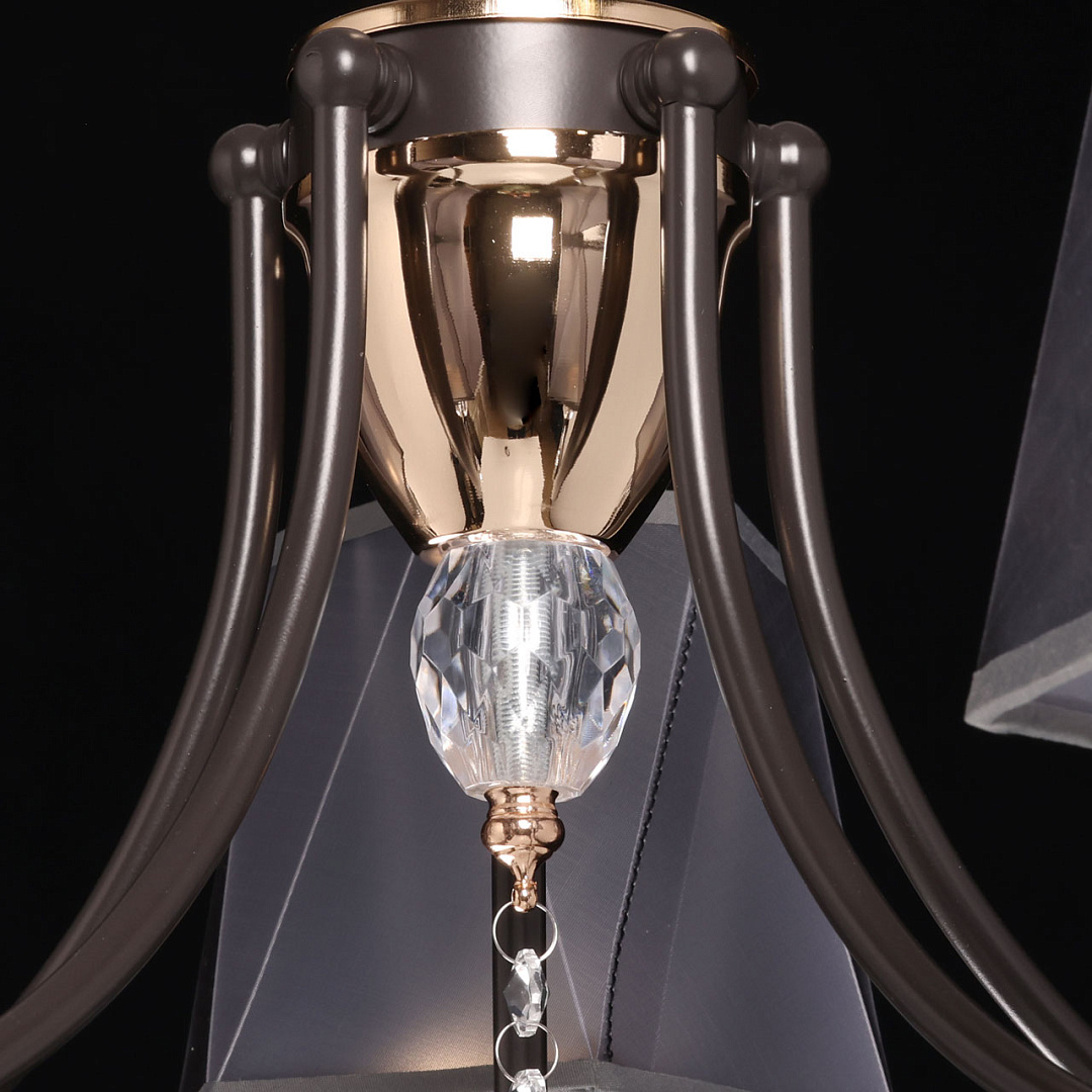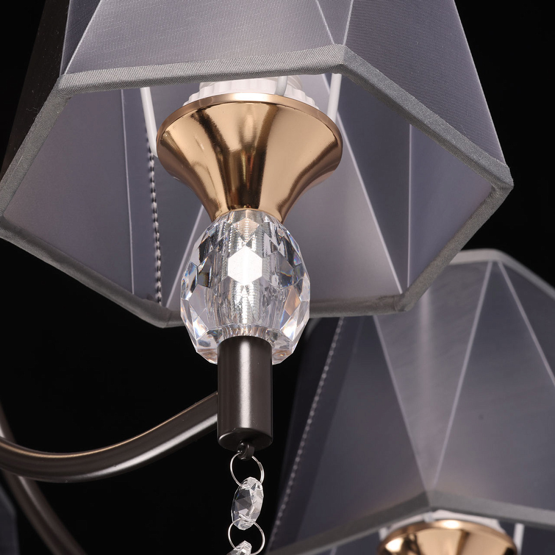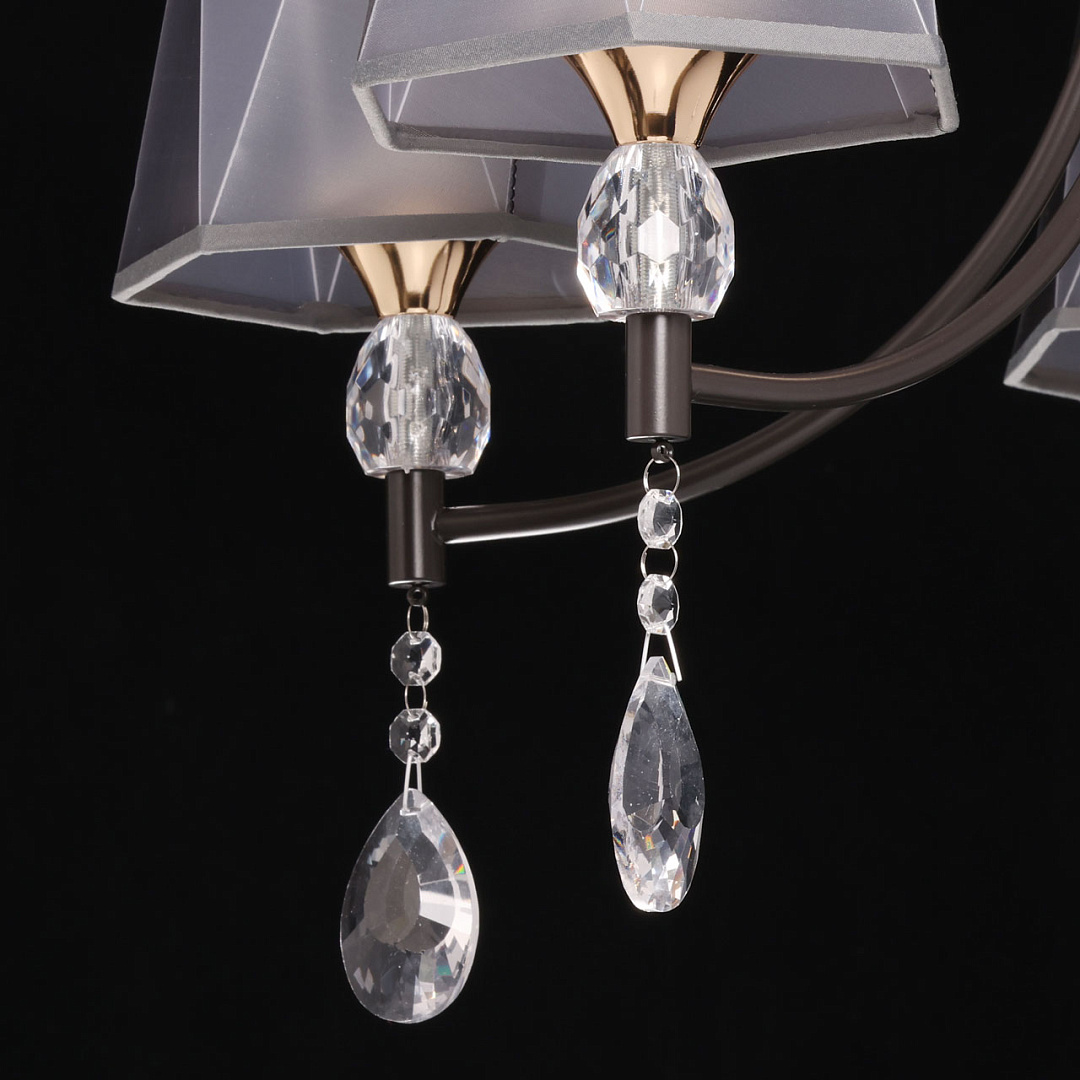 Теплый кофейный цвет основания люстры создает уютную атмосферу. Элементы в цвете золота придают дизайну люстры дополнительную изысканность. Текстильные абажуры создают мягкий комфортный свет. Термостойкий акрил повышает качество люстры и продлевает срок ее службы. Хрустальный декор эффектно подчеркивает игру света и отражения. Возможность устанавливать комфортную высоту. Заменяемые источники света удобны в эксплуатации.